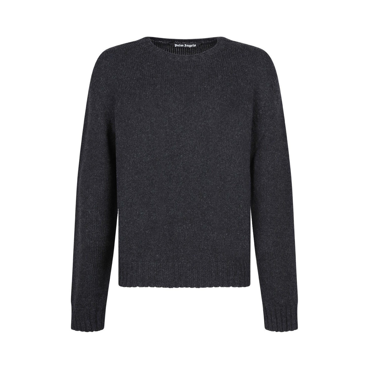 Palm Angels Dark Grey Sweater. Dark grey wool blend sweater, ribbed knit, melange effect. Intarsia knit logo, crew neck, long sleeves. Ribbed cuffs, ribbed hem and straight hem.