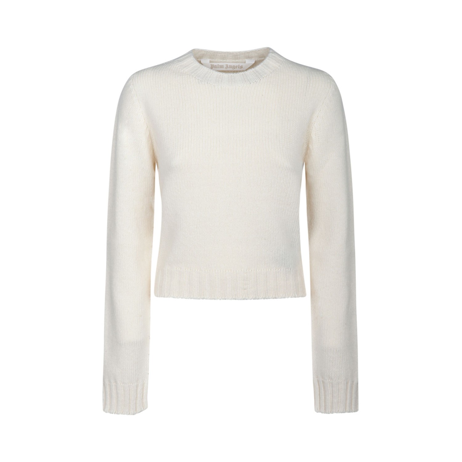 Palm Angels Ivory White Jumper. Ivory white wool blend jumper, knitted construction, crew neck, long sleeves. Embroidered logo to the rear, ribbed trim, curved high low hem.