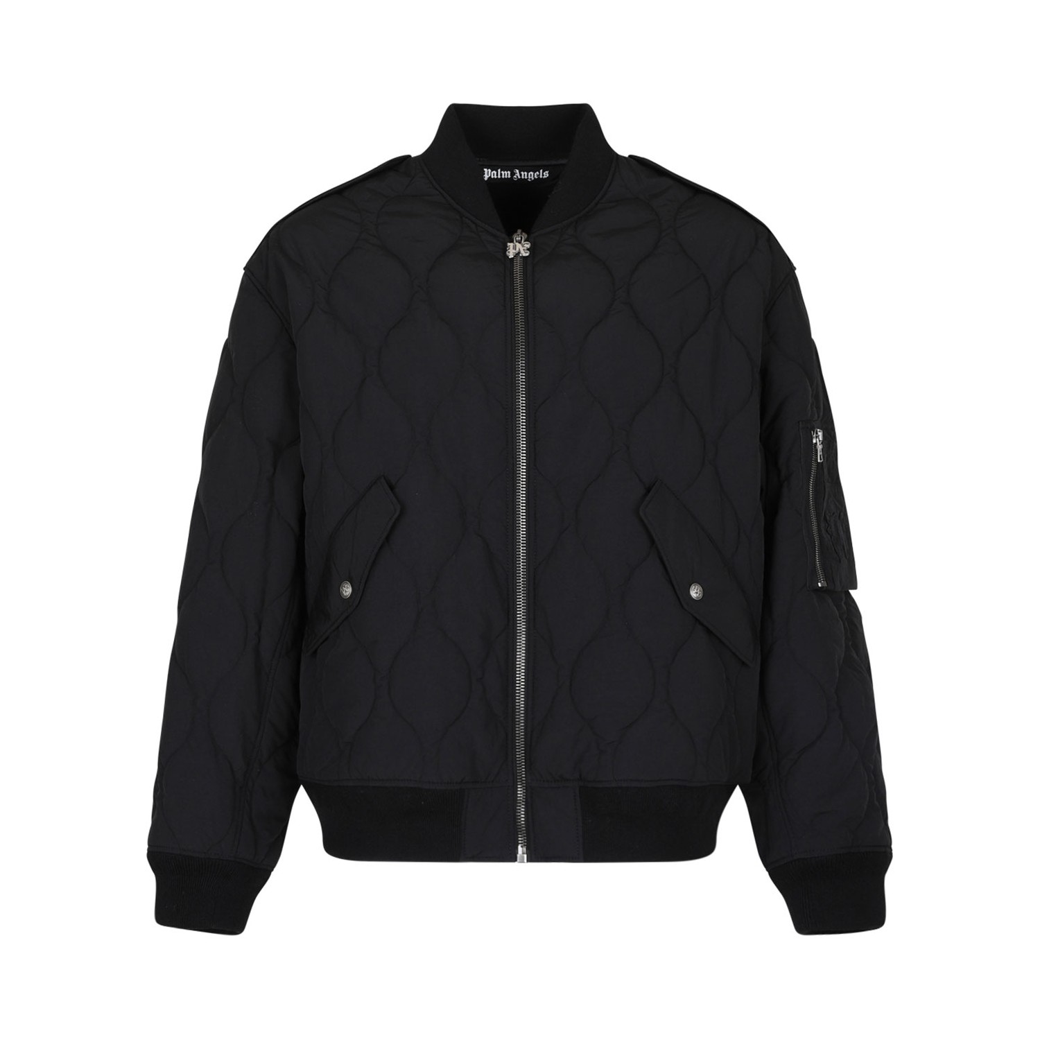 Palm Angels Black Quilted Bomber Jacket. Black padded design bomber jacket, quilted, silver tone hardware, applique logo. Branded zip puller, epaulettes, baseball collar, front zip fastening. Drop shoulder, long sleeves, ribbed cuffs and hem. Sleeve zip pocket, front flap pockets.