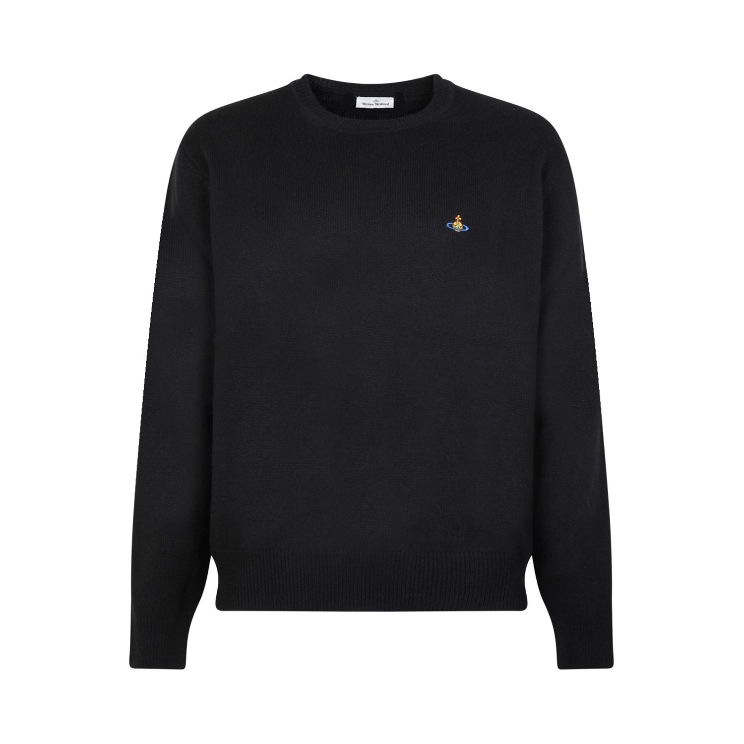 Vivienne Westwood Black Orb Embroidery Jumper. Black merino wool blend jumper, knitted construction, round neck, long sleeves, ribbed collar, cuffs and hem. Signature Orb logo embroidery, straight hem.