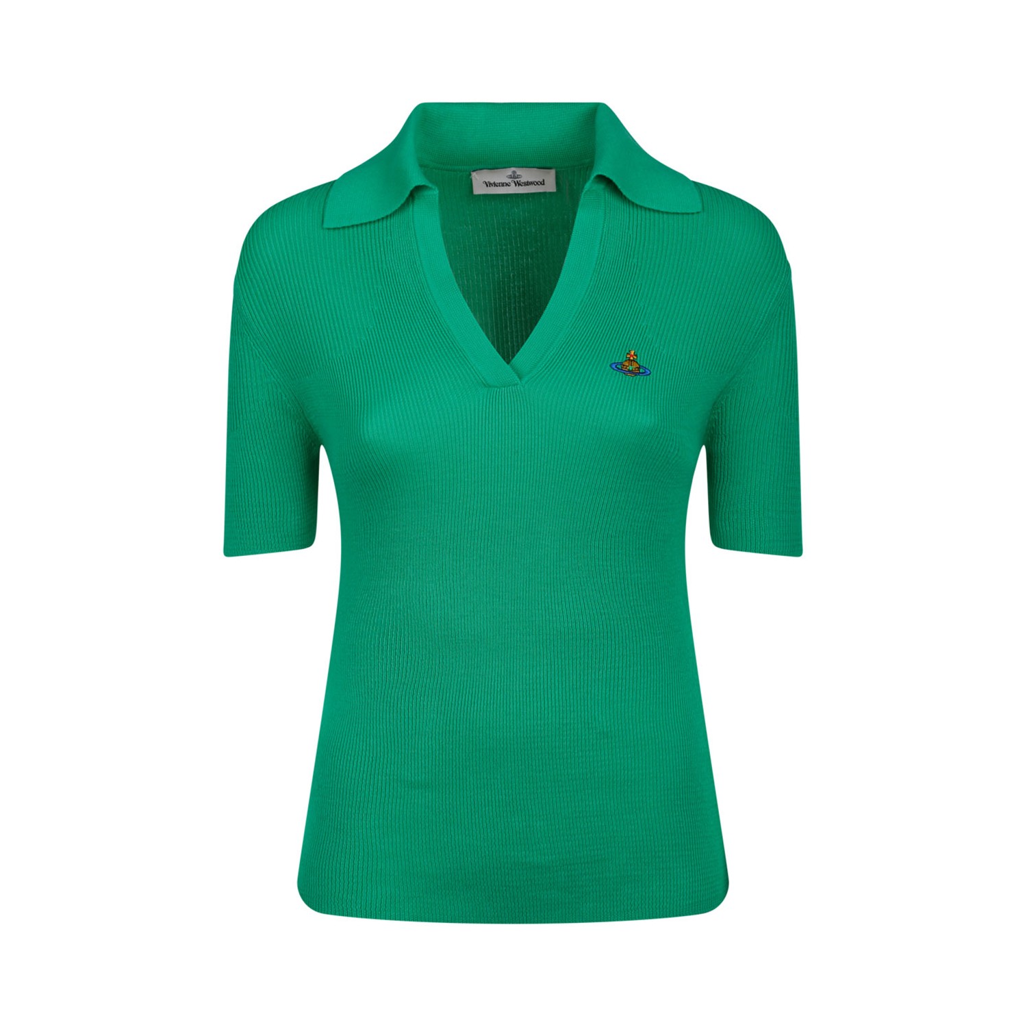 Vivienne Westwood Marina Green Polo Shirt. Green cotton polo shirt is knitted using a blend of recycled cotton with ribbed detailing. Straight hem, classic polo collar and short sleeves.