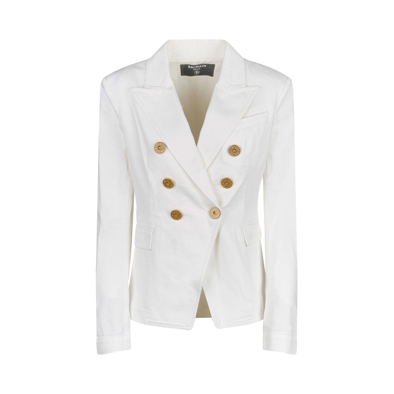 Balmain White Denim Double Breasted Blazer. White denim blazer, tight at the waist, pleated detail on the front. Tailored neckline with pointed lapel, structured shoulders, long sleeves, tailored cuffs. Five "Balmain chain" buttons, cross closure, six