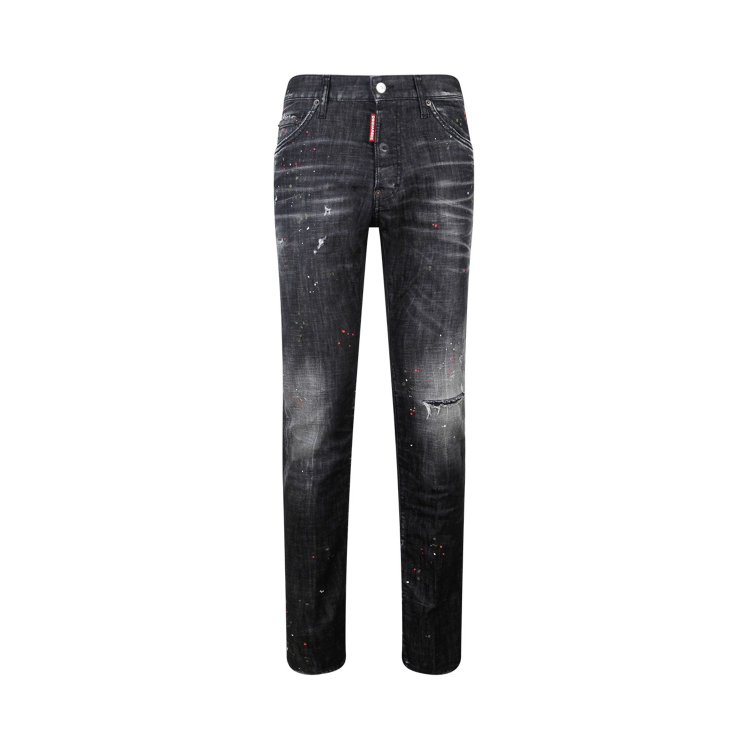 Dsquared Black Biker Jeans. Black five pocket jeans, waistband closed with button, logo label sewn on the flap. Sewed leather label eng on the back, two needle stitching.
