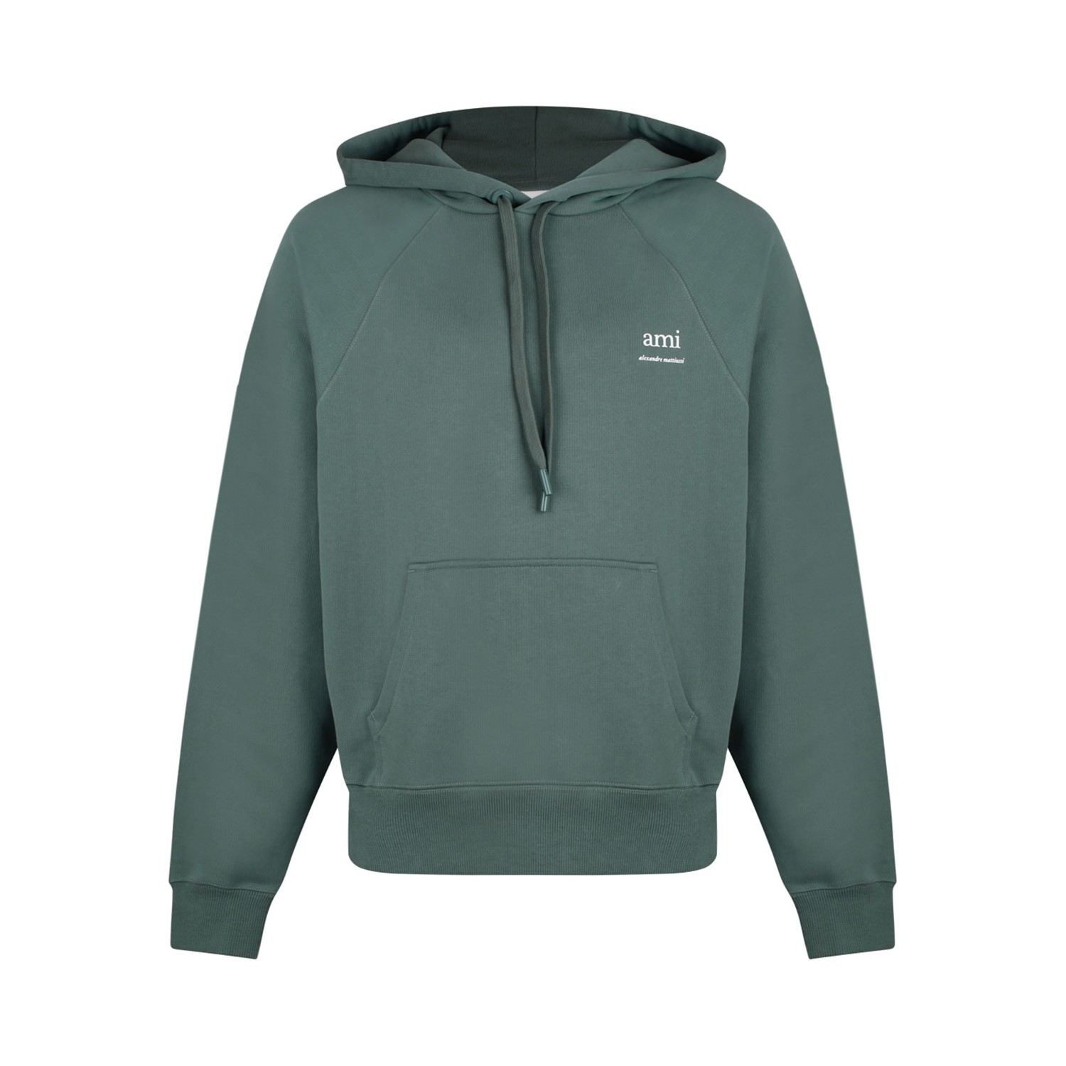 AMI Paris Antique Clay Logo Embroidered Hoodie. Antique clay organic cotton fleece hoodie, "ami alexandre mattiussi" print, tonal Ami de Coeur embroidery under back neckline. Raglan sleeves, boxy fit.