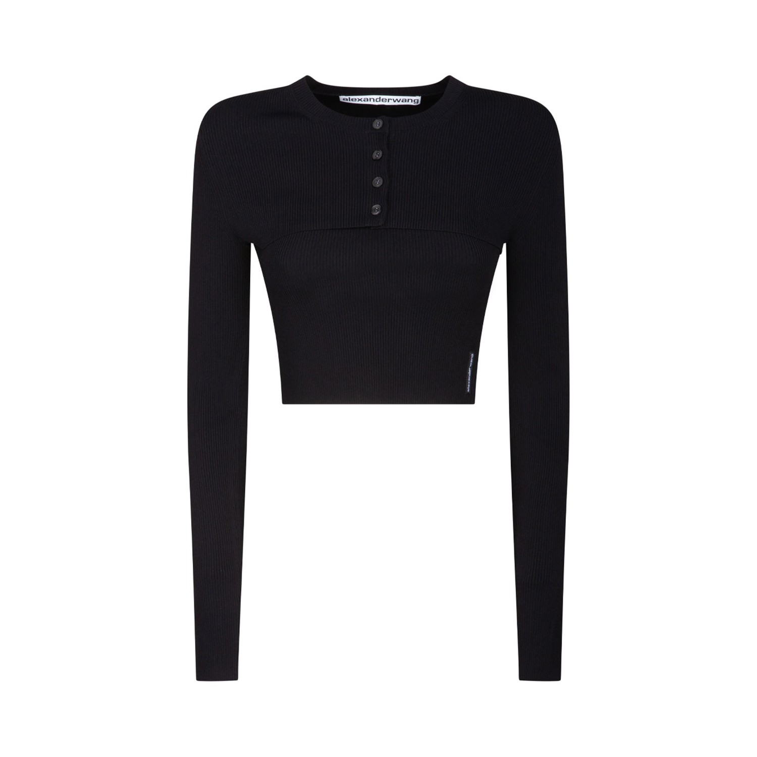 Alexander Wang Black Two Piece Set. Black ribbed knit cardigan and top. Cradigan: round neck, front button fastening, long sleeves, straight hem, cropped, logo patch to the side. Top: V neck, sleeveless, straight hem.