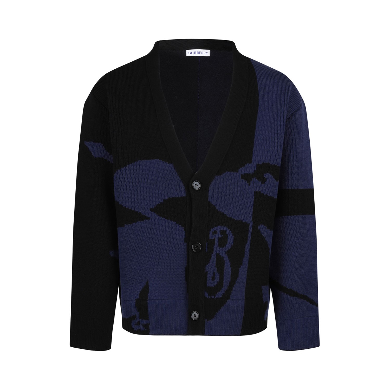Burberry Black and Navy Blue EKD Cardigan. Black and navy blue wool cardigan, ribbed knitm signature Equestrian Knight jacquard motif. Front button fastening, V neck, long sleeves. Ribbed cuffs, rear slit and straight hem.
