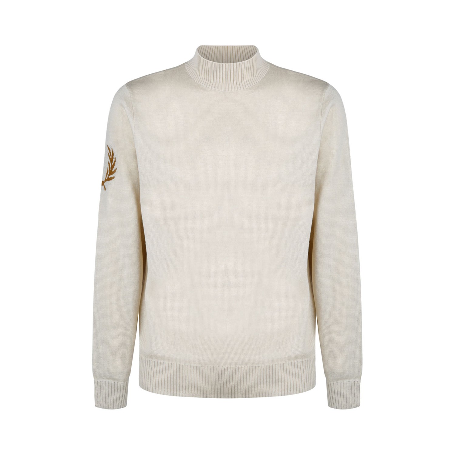 Fred Perry Cream Wool Mock Neck Jumper. Cream wool jumper, intarsia knit logo, ribbed edge, mock neck, extra long sleeves, straight hem.