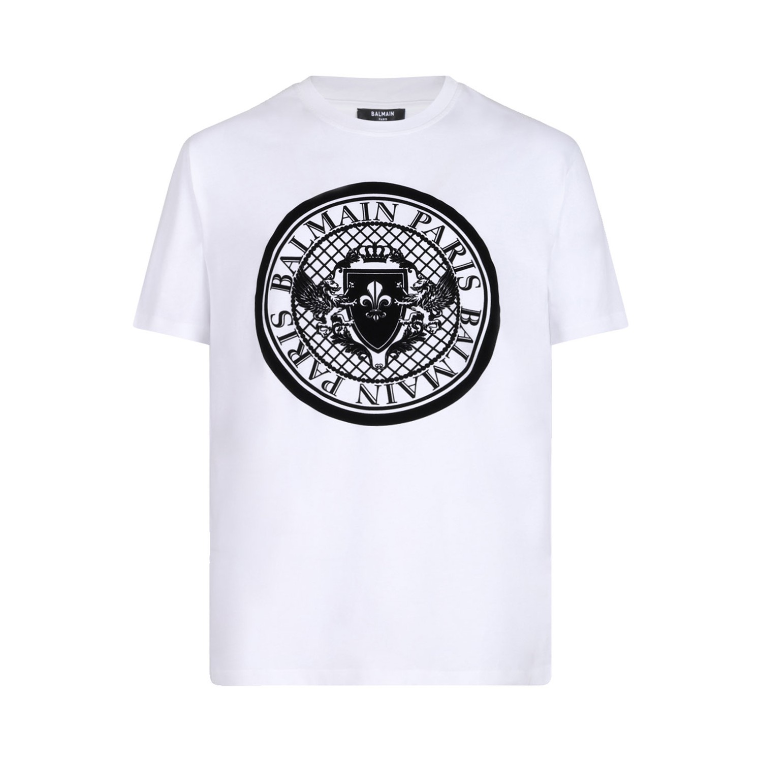 Balmain White Flocked Coin T-Shirt. White cotton t-shirt, logo print to the front, round neck, short sleeves, straight hem.
