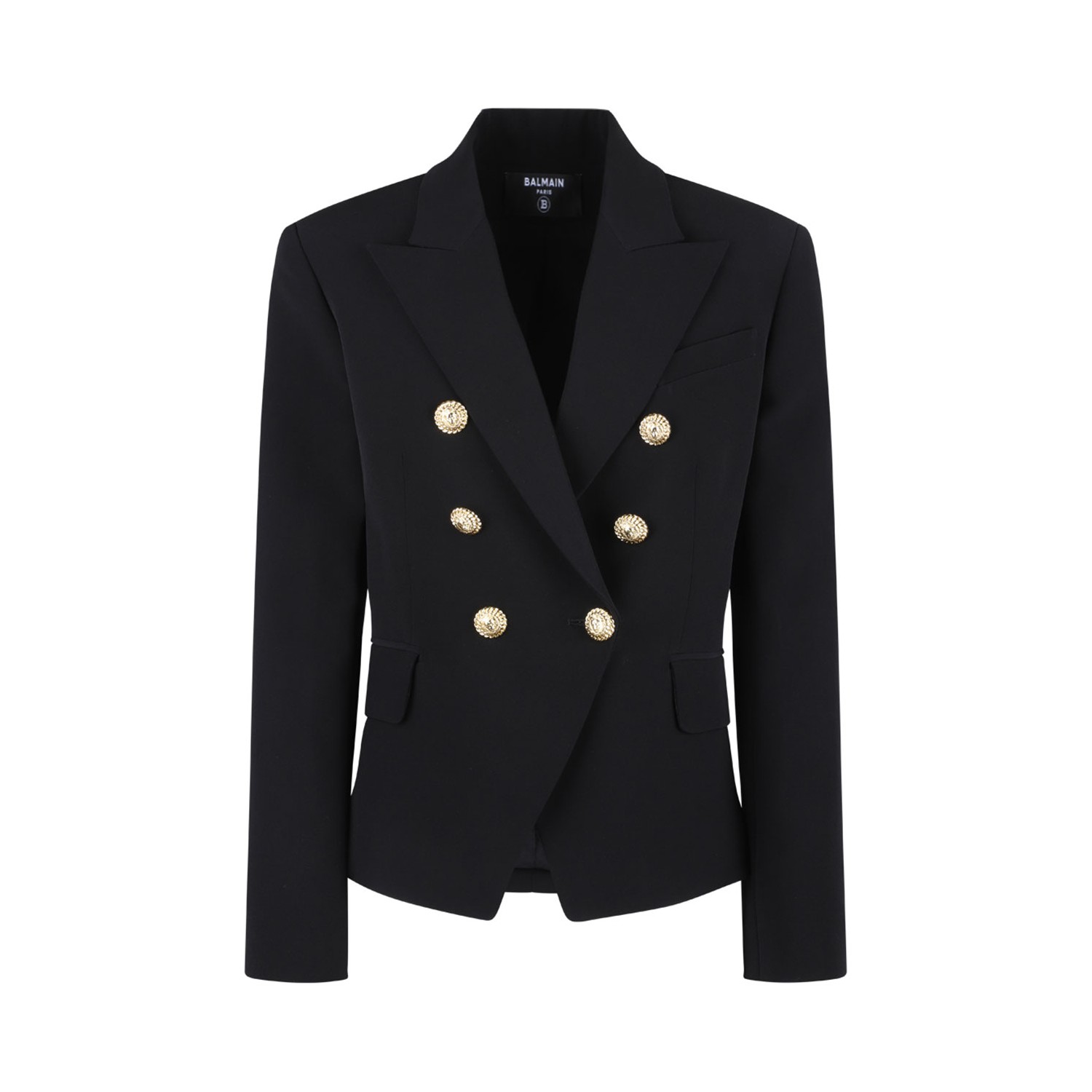 Balmain Black Double Breasted Blazer. Black crepe texture blazer, peak lapels, shoulder pads, long sleeves with buttoned cuffs. Gold-tone Double Chain Lion buttons, chest welt pocket, dart detailing, two side flap pockets. Full lining and double-breasted button fastening.