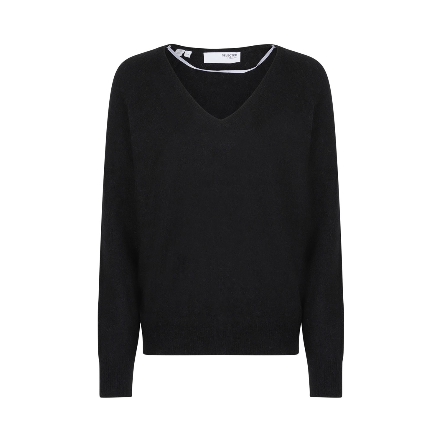 Selected Black Knitted Sweater. Black alpaca wool sweater, ribbed V neck, long raglan sleeves. Ribbed cuffs and hem.
