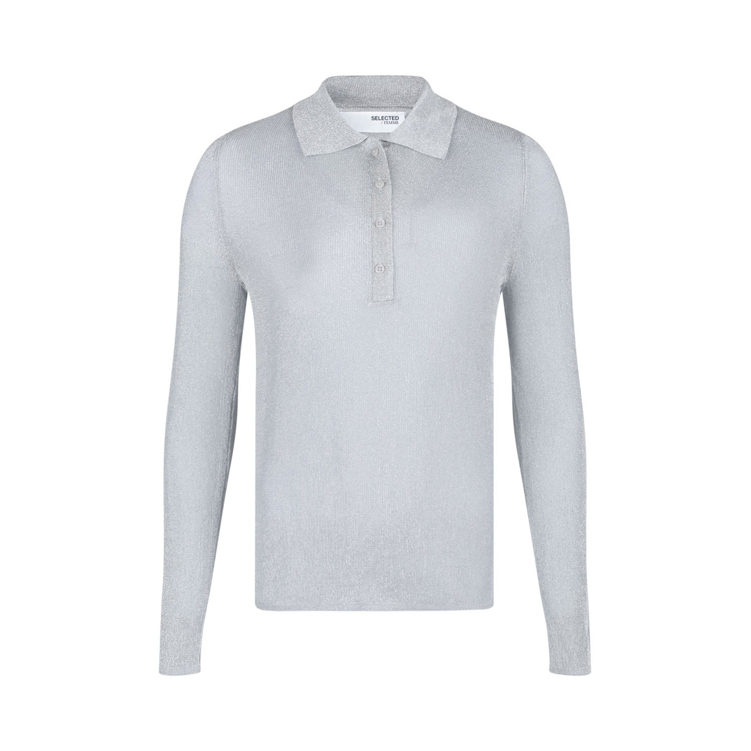 Selected Silver Polo Shirt. Silver metallic polo-style top, polo collar, half-button placket, long sleeves.