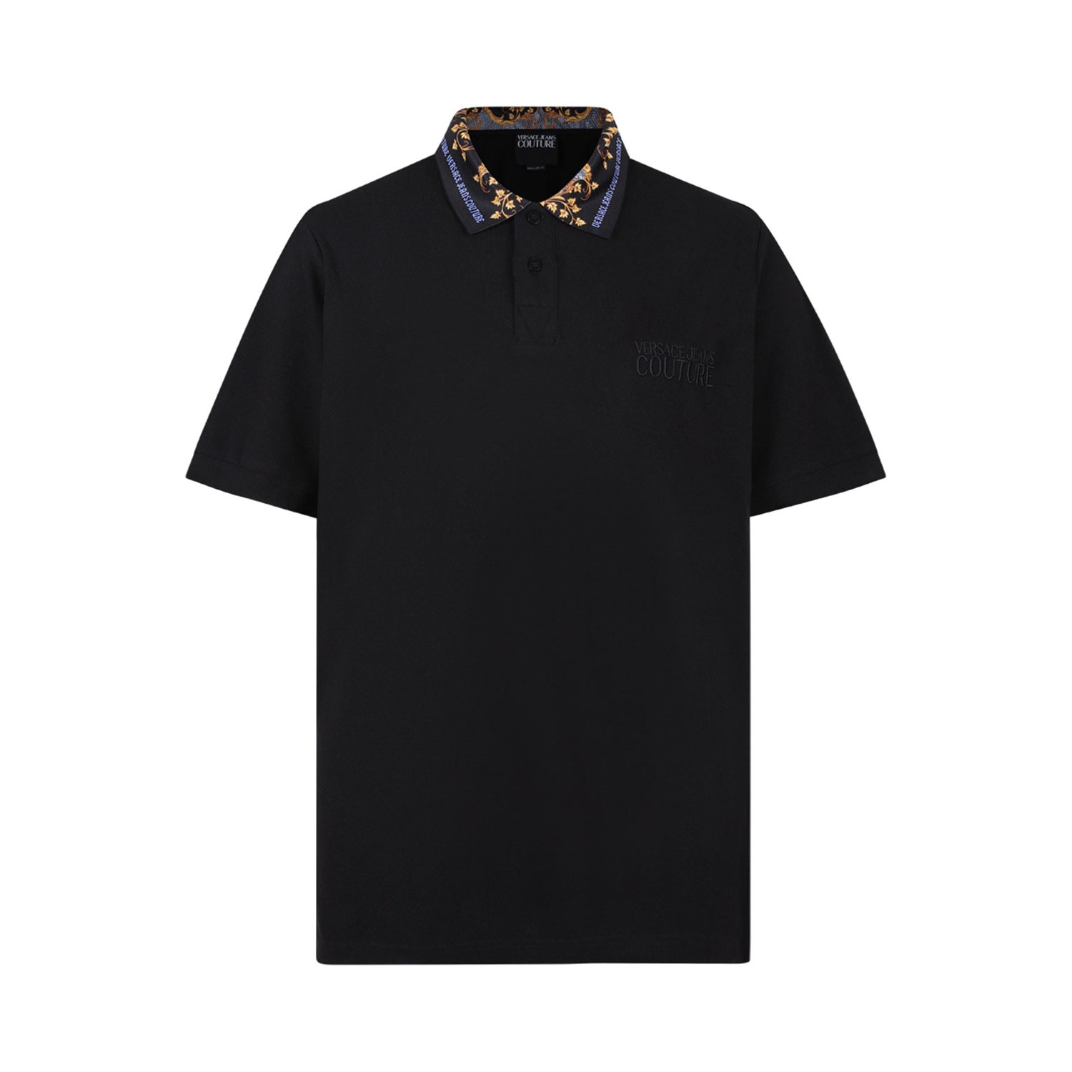 Versace Jeans Couture Black Polo Shirt. Black cotton polo shirt, pique weave, logo print at the neckline, embroidered logo at the chest. Polo collar, short sleeves, short side slits, straight hem and front button placket.