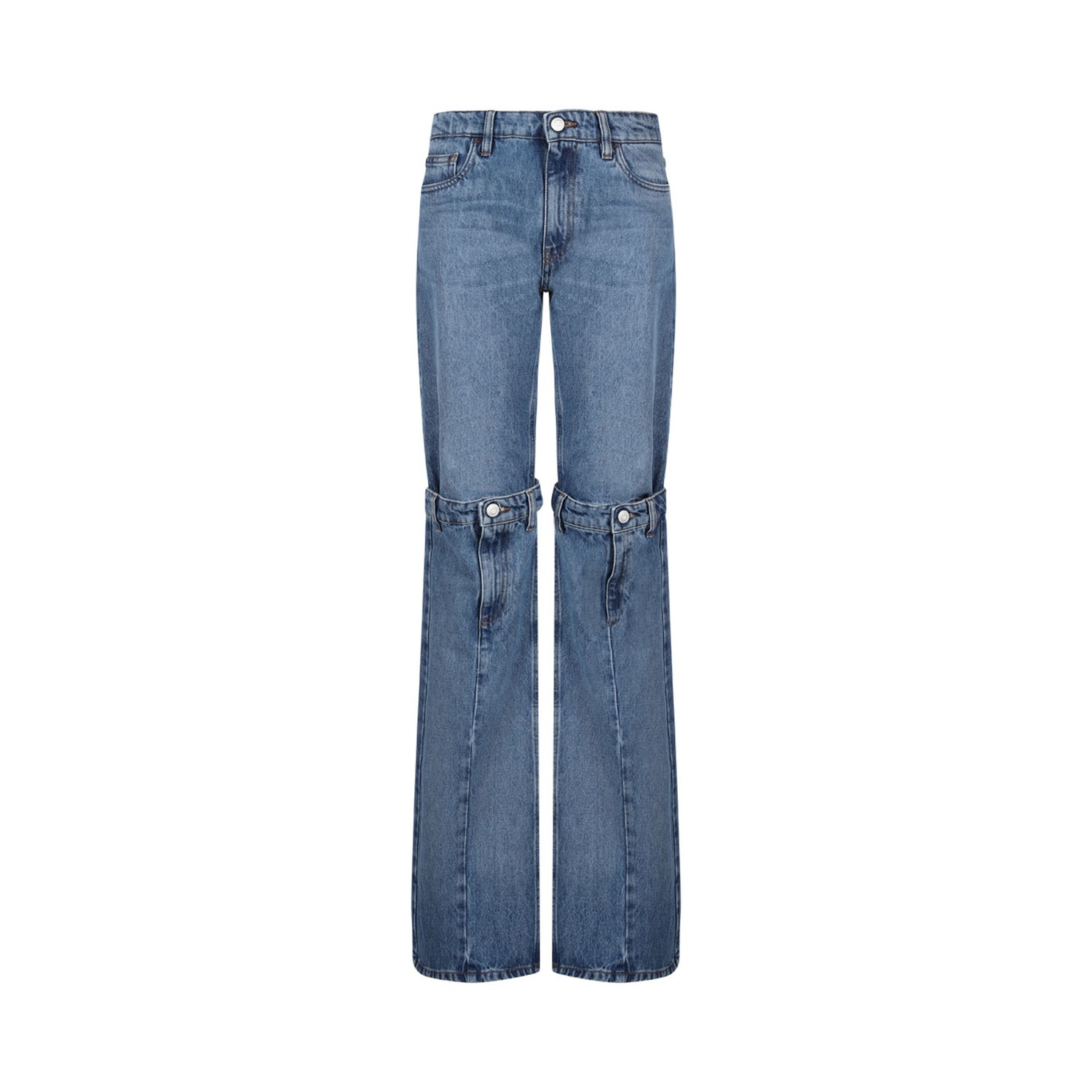 Coperni Blue Mid Rise Jeans. Blue cotton jeans, washed denim, panelled design, contrast stitching, mid-rise, belt loops. Classic five pockets, whiskering effect at the thighs, open knee with fly and button fastening. Wide leg, unlined, concealed fly and button fastening.