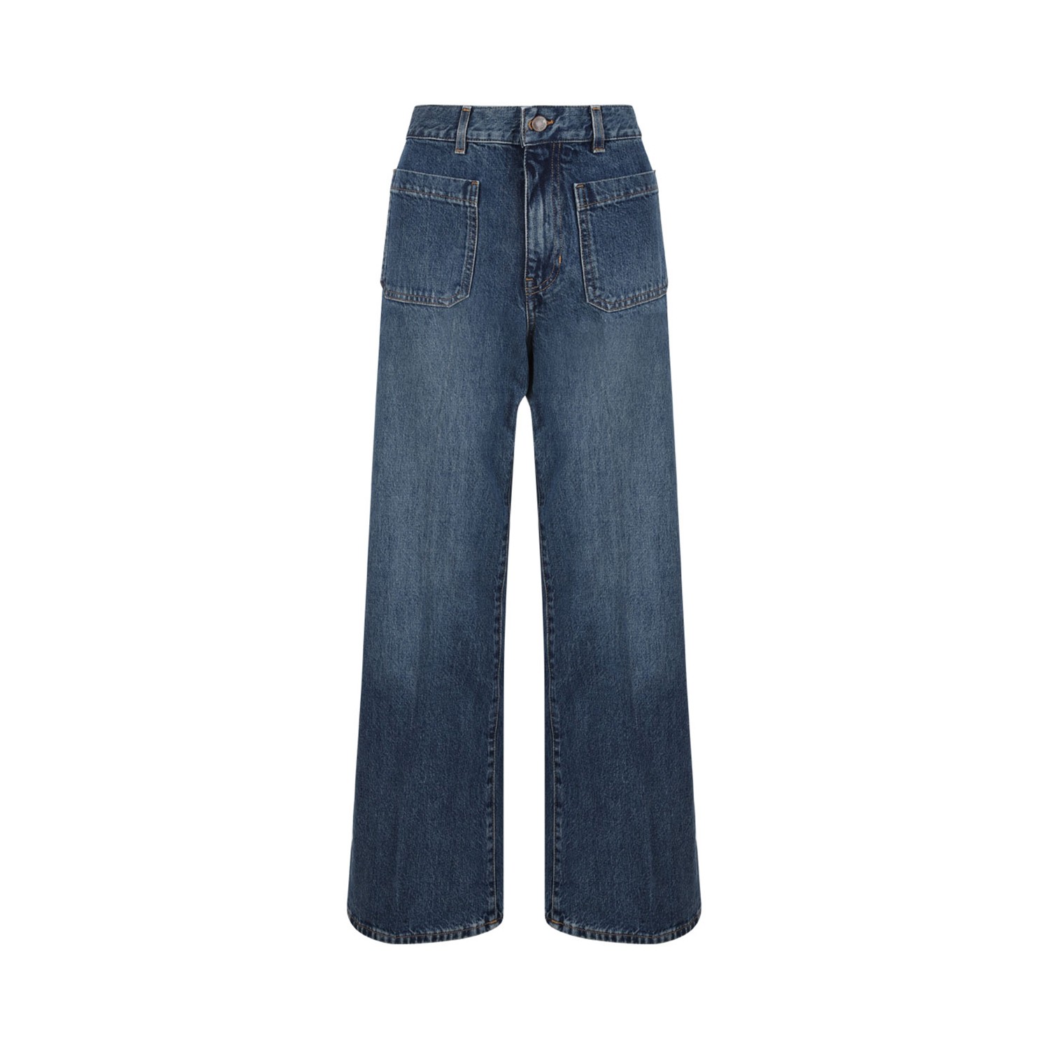 Chloe Dark Blue Bootcut Denim Jeans. Dark blue cotton jeans, front zip and Chloe engraved button fastening, front patch pockets. Belt loops, Chloe logo applique on the back.