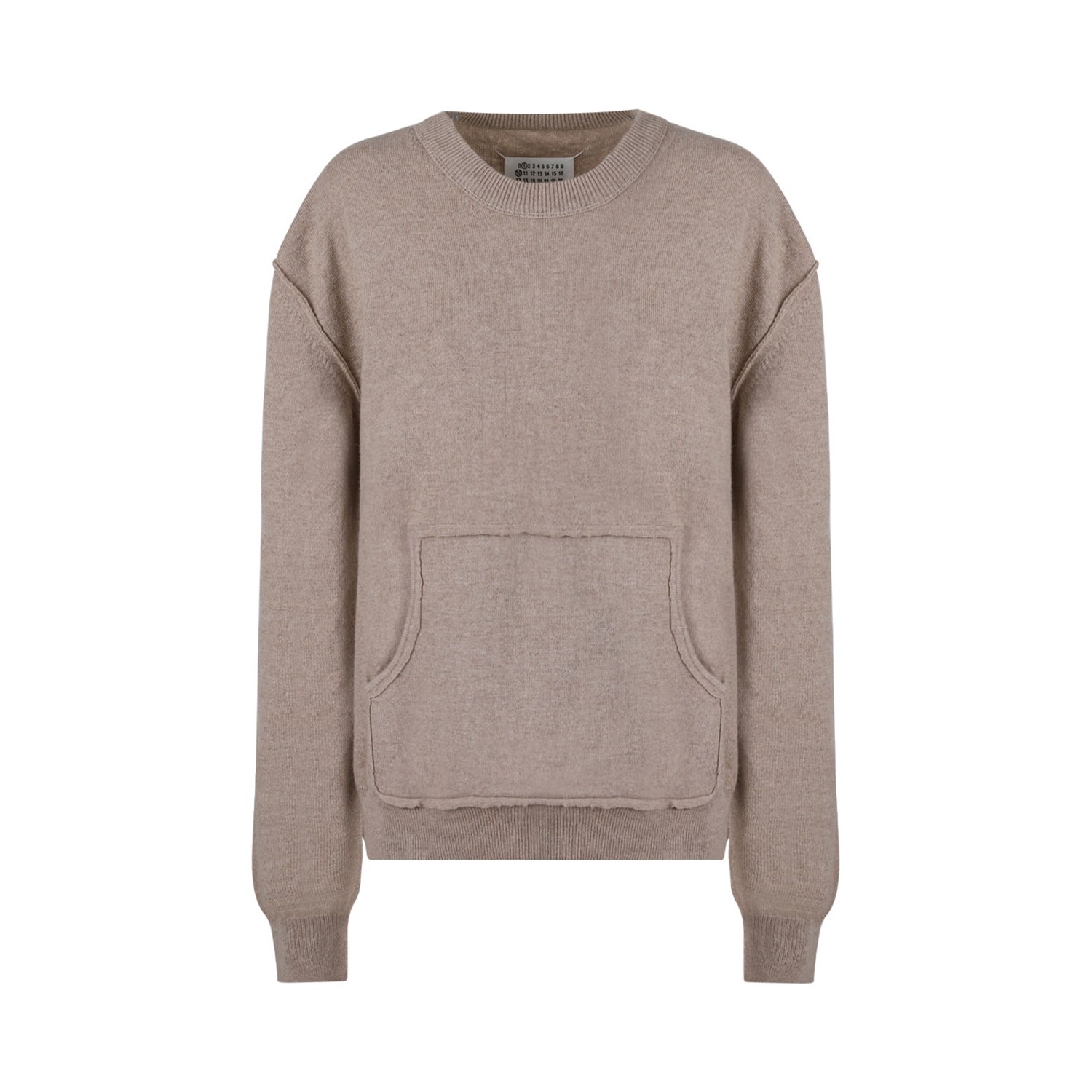 Maison Margiela Light Brown Jumper. Light brown wool cashmere blend jumper, knitted construction, inside-out effect seams. Crew neck, long sleeves, ribbed cuffs and hem. Front pouch pocket and straight hem.