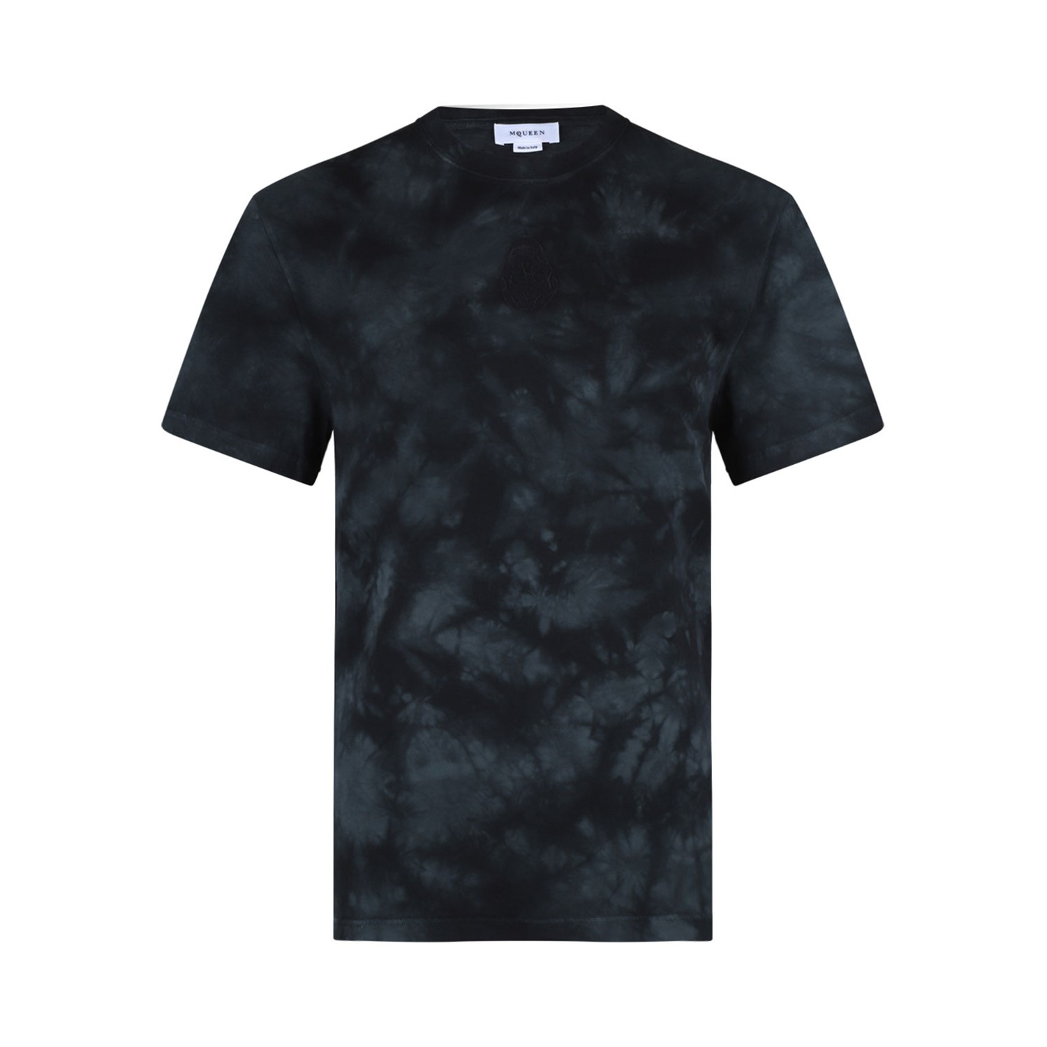 Alexander Mcqueen Washed Dye T-Shirt. Black and grey cotton t-shirt, jersey texture, tie-dye print, washed, crew neck. Short sleeves, skull embroidery to the front, straight hem.
