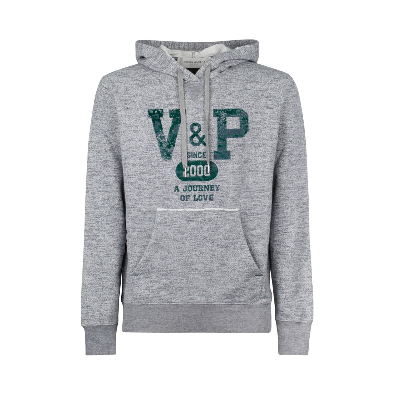 Golden Goose Grey Hooded Sweatshirt. Grey cotton hooded sweatshirt, crew neck, sleeves with a distressed effect, long sleeves, green writing printed in the center.