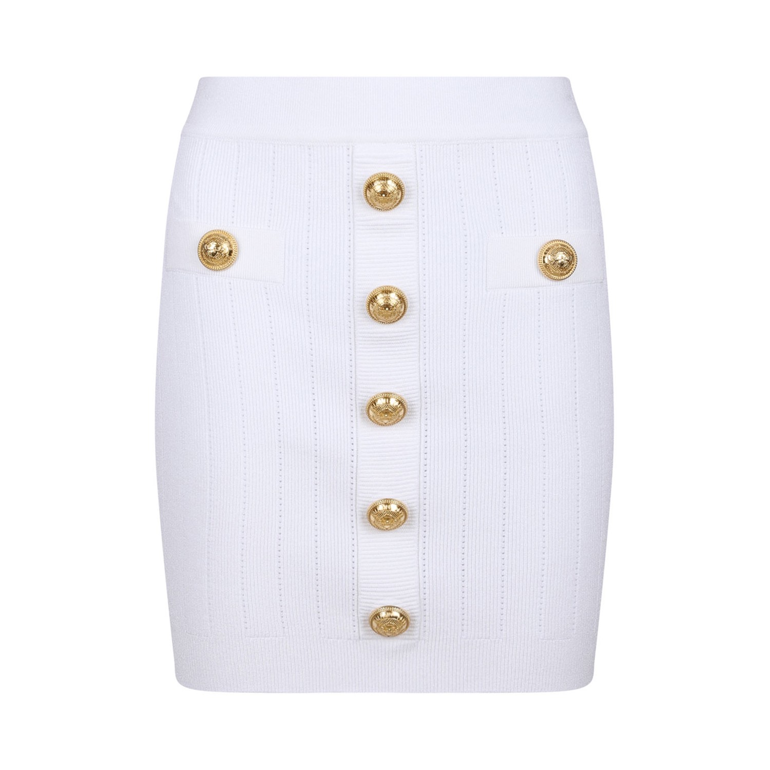 Balmain White High Waist Miniskirt. White knitted construction miniskirt, faux pocket detail, embossed gold-tone buttons. Ribbed trim, high waist, rear zip fastening. Straight hem and thigh-length.