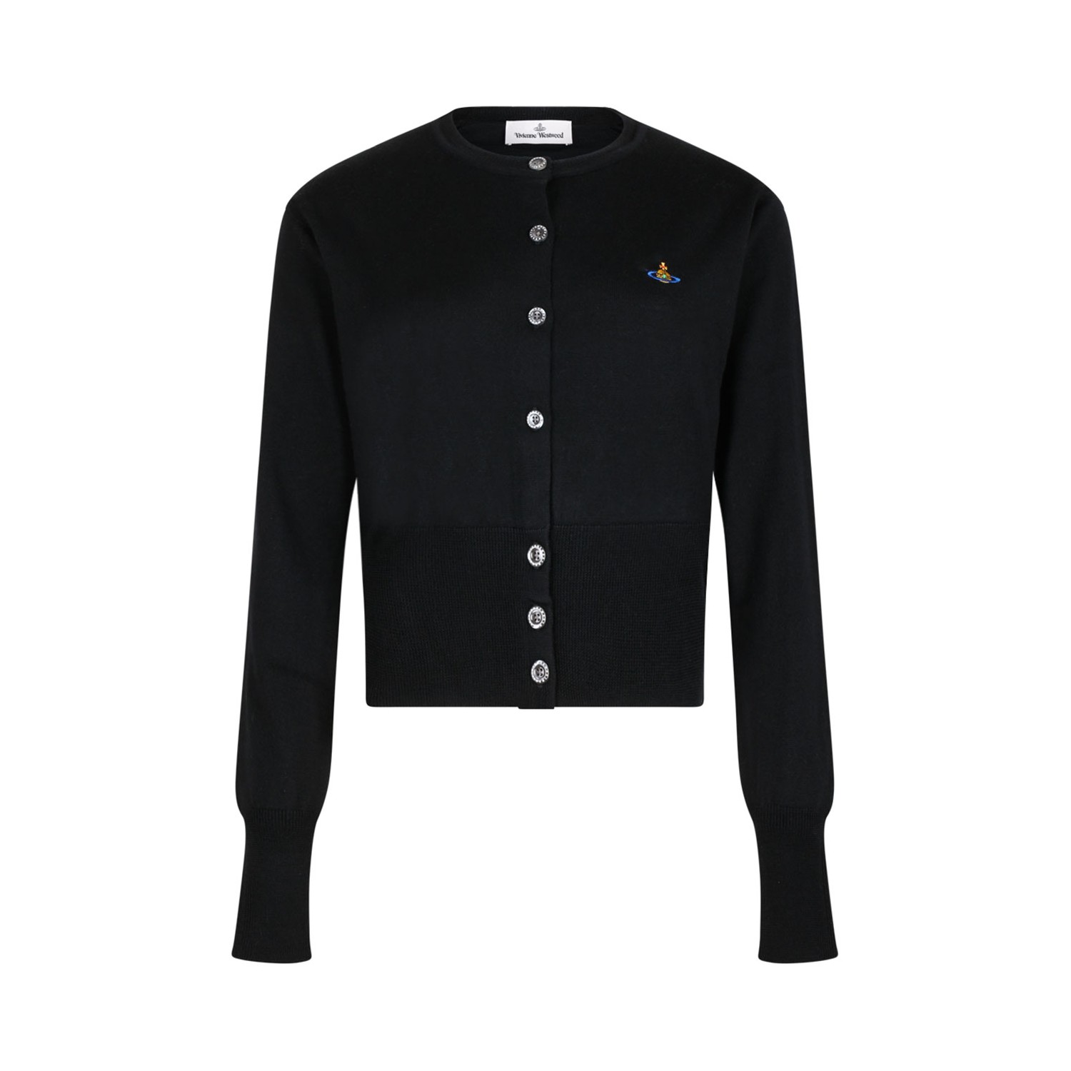 Vivienne Westwood Black Bea Cardigan. Black virgin wool bea cardigan. Fine mesh, front button, closure, ribbed finish, choker, long sleeves, logo on the chest, straight hem, crop design.