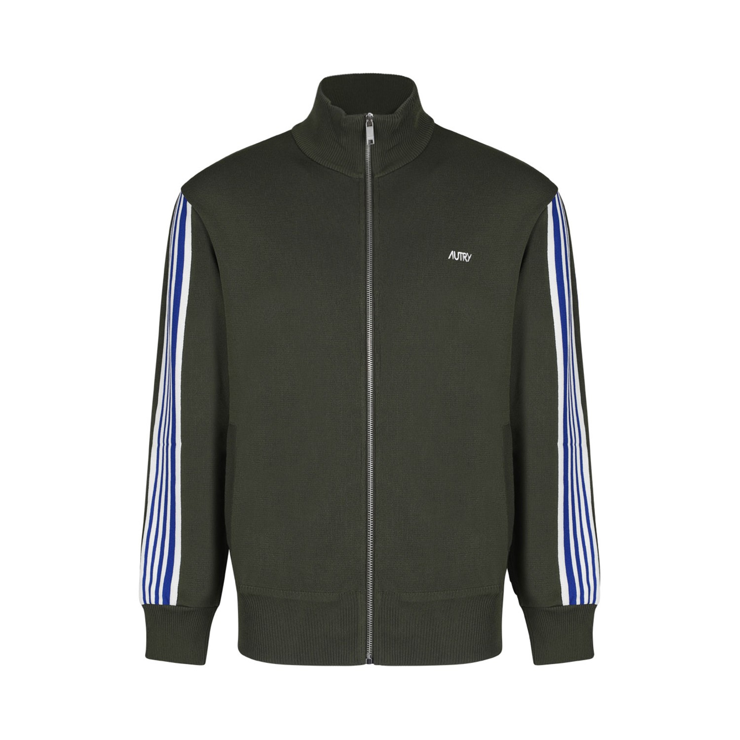 Autry Stripe Detail Cardigan. Olive green cardigan, front zip fastening, two side welt pockets, ribbed cuffs and hem, high neck.