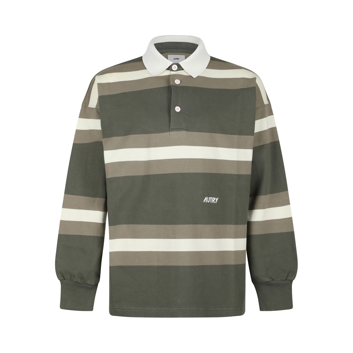 Autry Stripe Pattern Polo Shirt. Multicolour cotton polo shirt, polo collar, front buttoning, long sleeves. Elasticated cuffs, all-over striped pattern, logo detail on the front.
