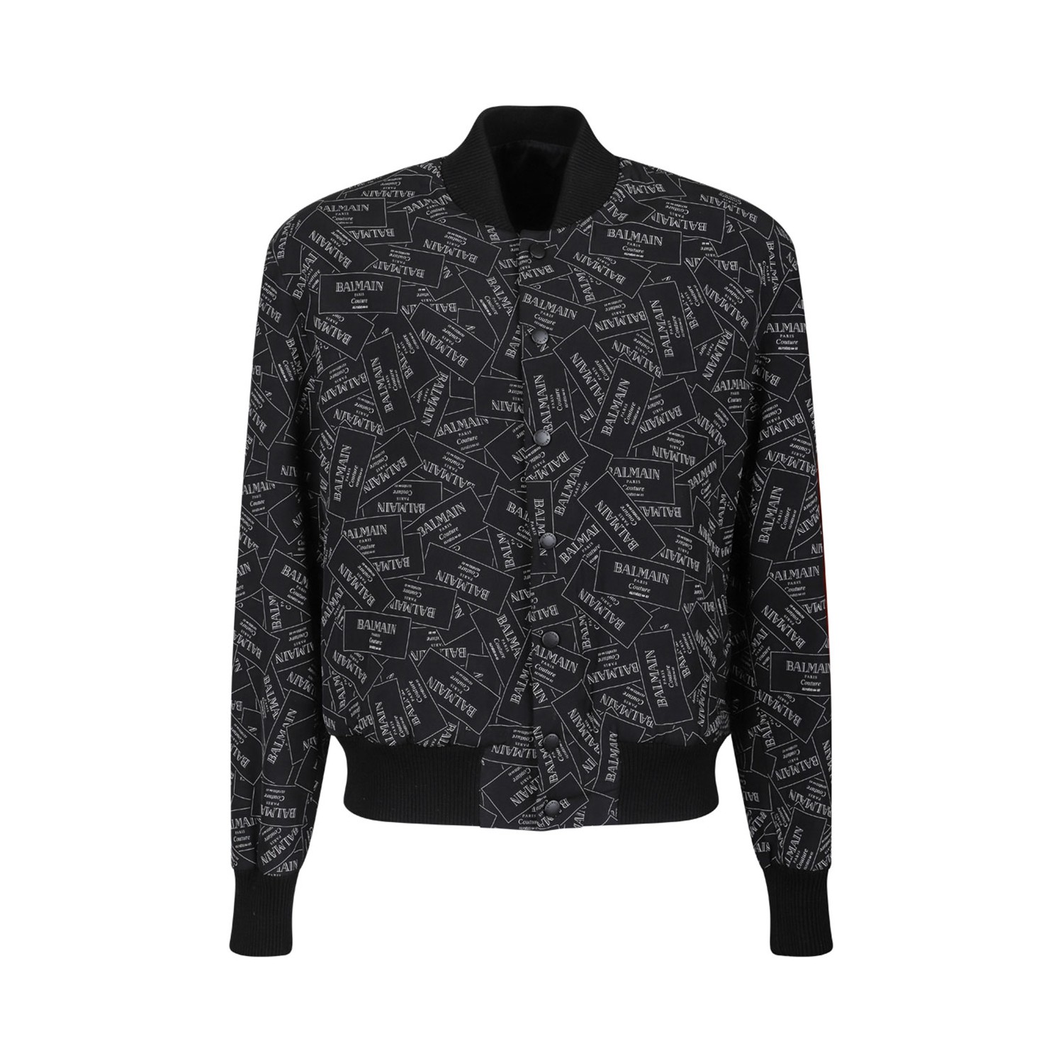 Balmain Printed Bomber Jacket. Black and white bomber jacket, all-over logo print, front press-stud fastening. Ribbed band collar, long sleeves, two press-stud fastening side pockets, ribbed cuffs and hem.