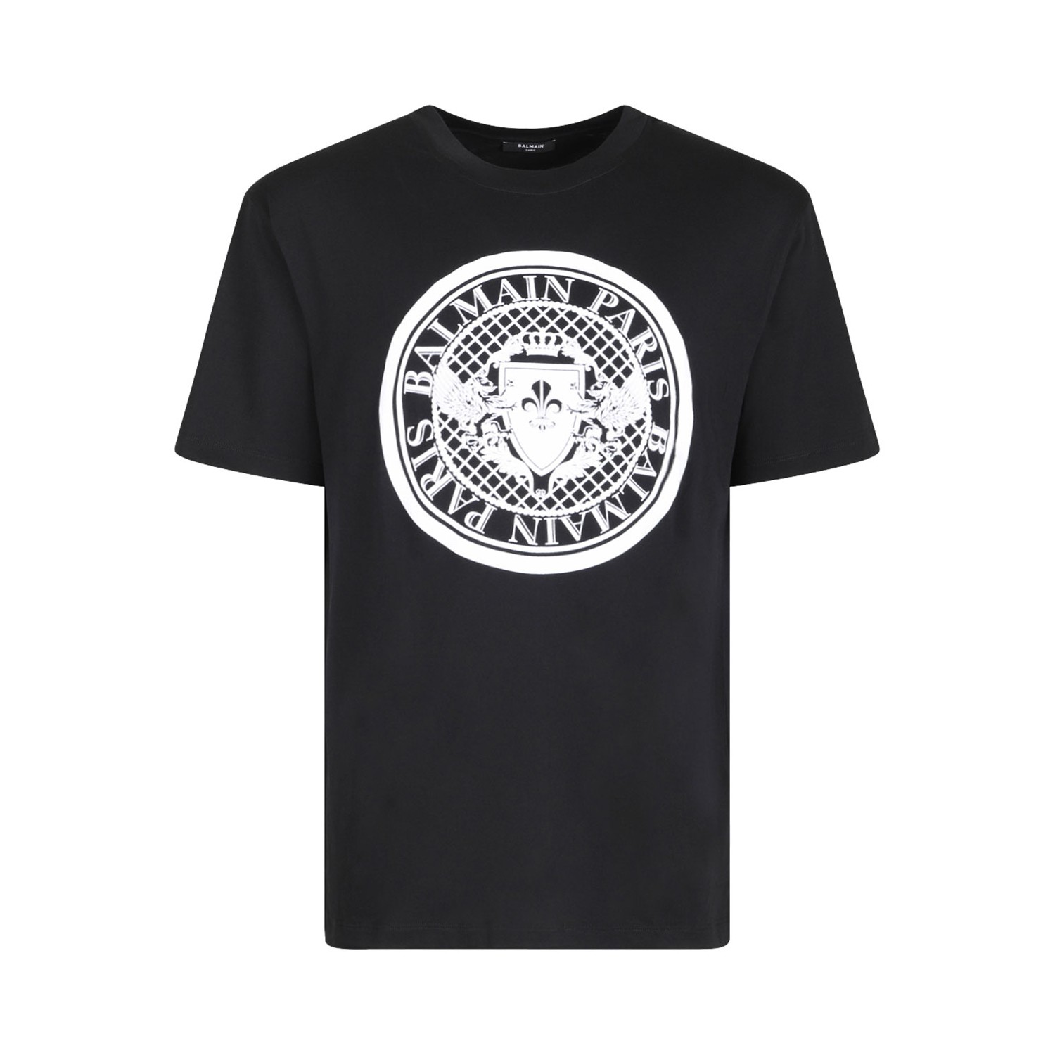 Balmain Black Flocked Coin T-Shirt. Black cotton t-shirt, logo print to the front, round neck, short sleeves, straight hem.