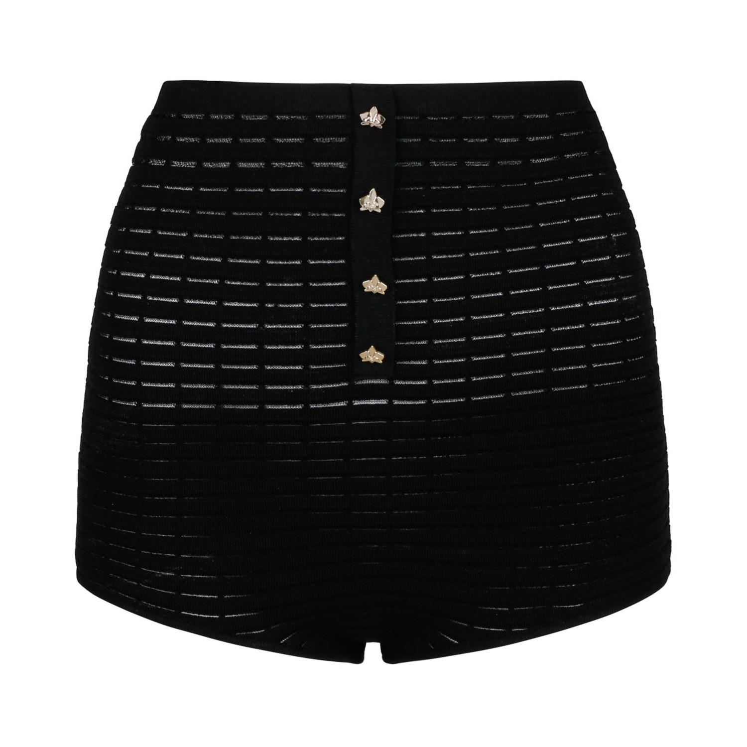 Genny Black Blockchain Shorts. These high-waisted knit shorts feature a slim fit that flatters the silhouette, embellished with the iconic Blockchain embroidery and a row of small decorative buttons inspired by the Orchid motif on the front. The refined details add a touch of elegance and femininity, making this garment sophisticated and unique, perfect for those seeking an exclusive and refined style.