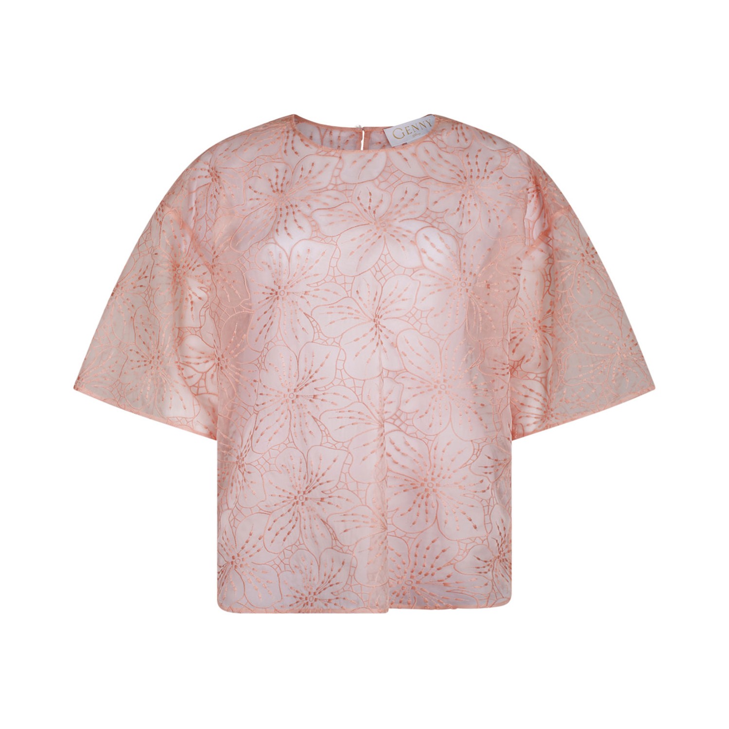 Genny Light Pink Orchid Embroidery T-Shirt. Light pink fine silk T-shirt, embellished with an elegant orchid-themed floral embroidery. The crew neck design and oversized fit give a relaxed and modern elegance, while the length that goes above the hips adds a touch of sophisticated femininity.