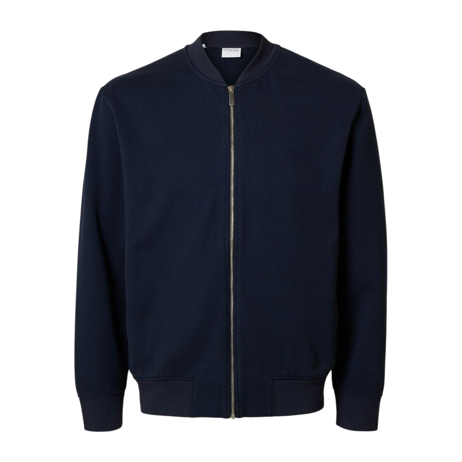 Selected Sky Captain Jersey Bomber Jacket. Sky captain bomber jacket with baseball collar, zip-up front, slightly dropped shoulders. Long sleeves, fitted cuffs and waistband. Welted side pockets and relaxed fit.