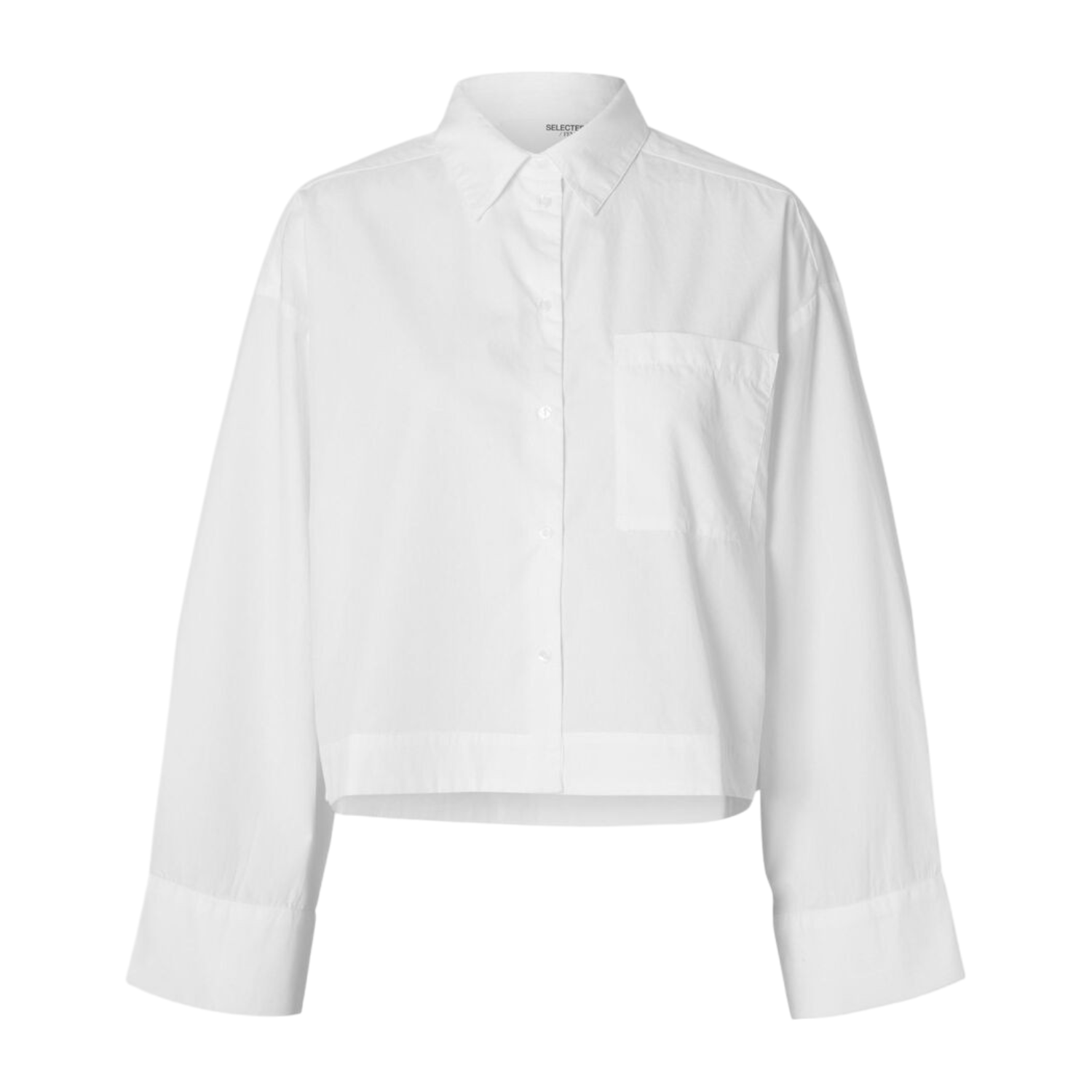 Selected Bright White Cropped Shirt. Bright white cotton shirt, shirt collar, button-up front. Dropped shoulders, wide sleeves with buttoned cuffs. Patch pocket at chest and cropped boxy fit.
