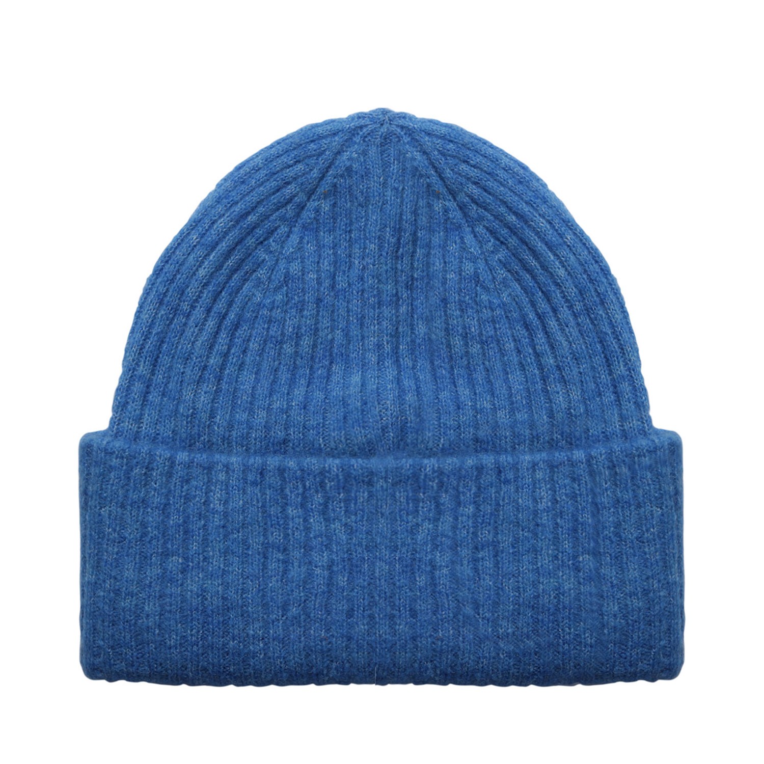 Selected Electric Blue Beanie. Electric blue merino wool beanie, wide turn up brim, knitted texture.