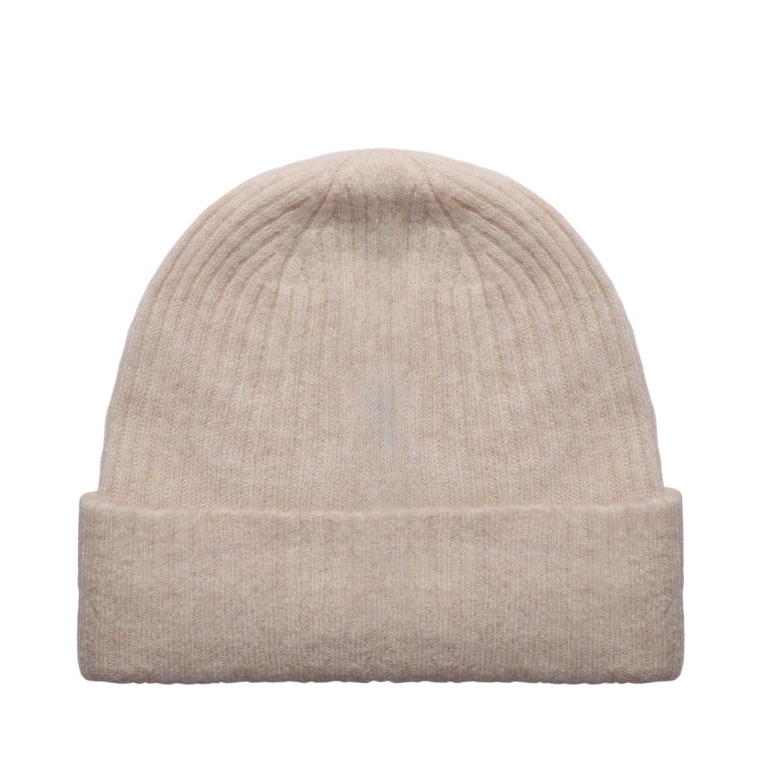 Selected Birch Melange Beanie. Birch melange merino wool beanie, wide turn up brim, knitted texture.
