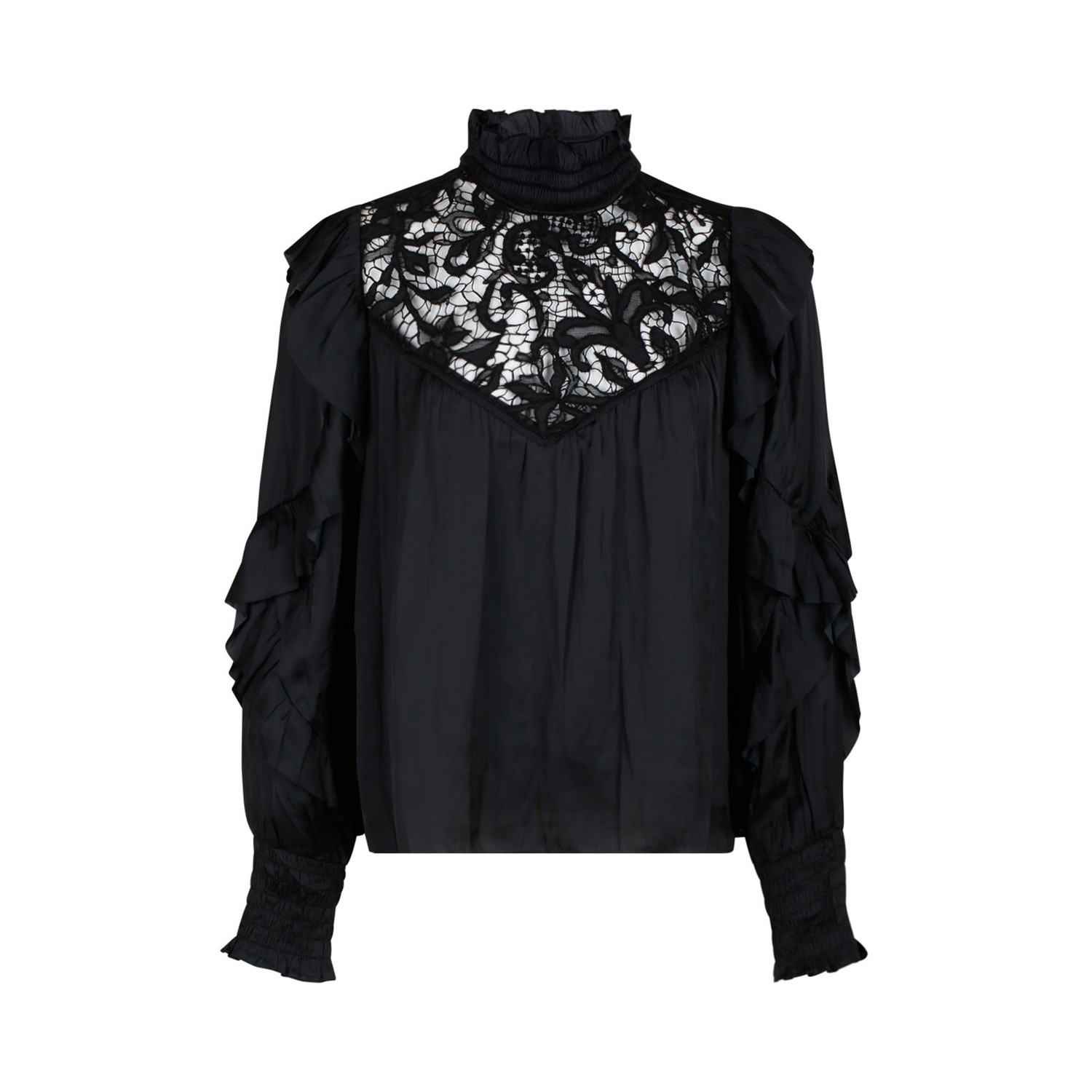 Isabel Marant Black Seila Blouse. Black cotton blouse, lace panelling, rear button fastening, gathered neckline. Ruffled detailing, bishop sleeves.
