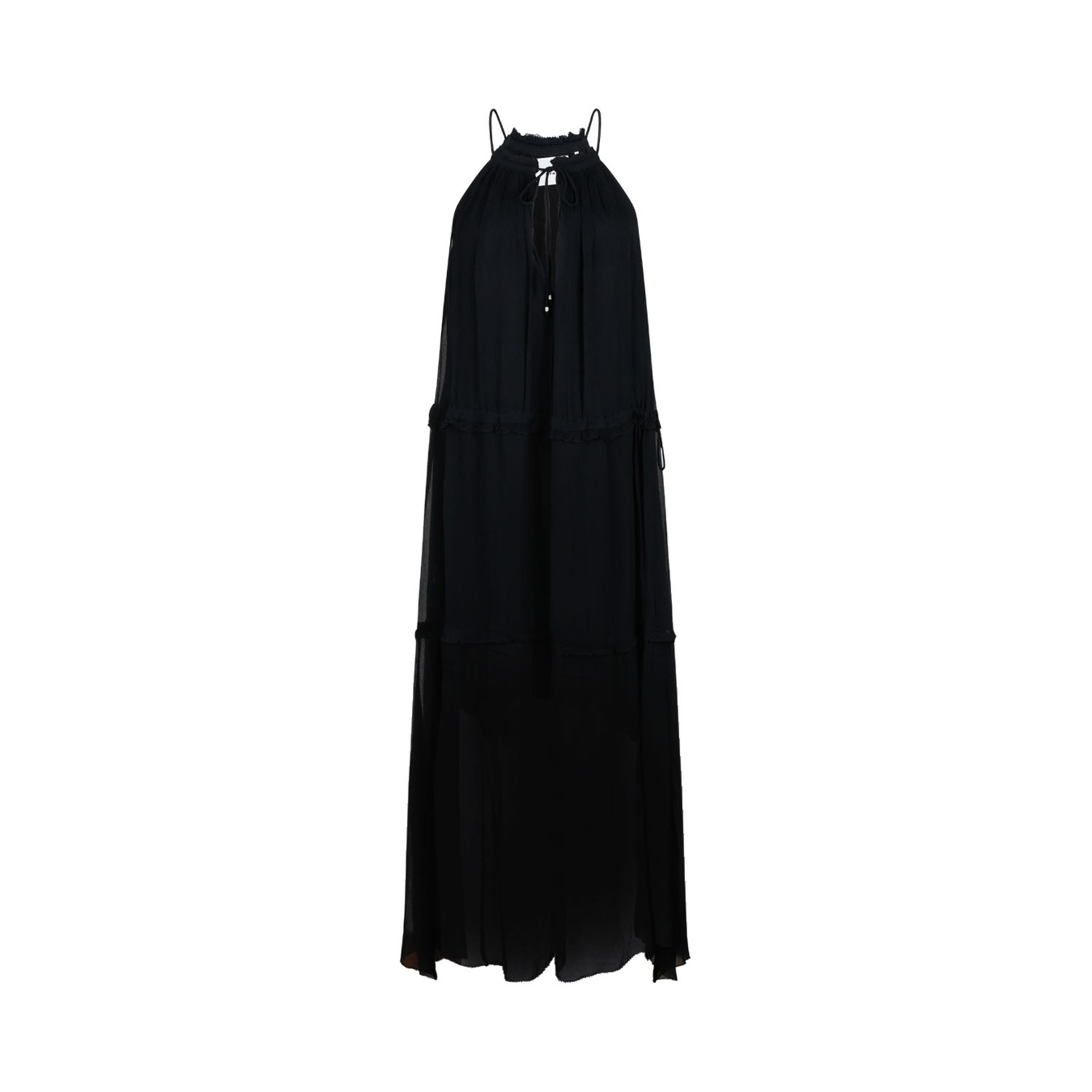 Isabel Marant Etoile Black Alita Maxi Dress. Black plisse effect maxi dress, drawstring neck, keyhole neck, sleeveless, elasticated waistband. Ruffled trim, partial lining, flared hem, long length.