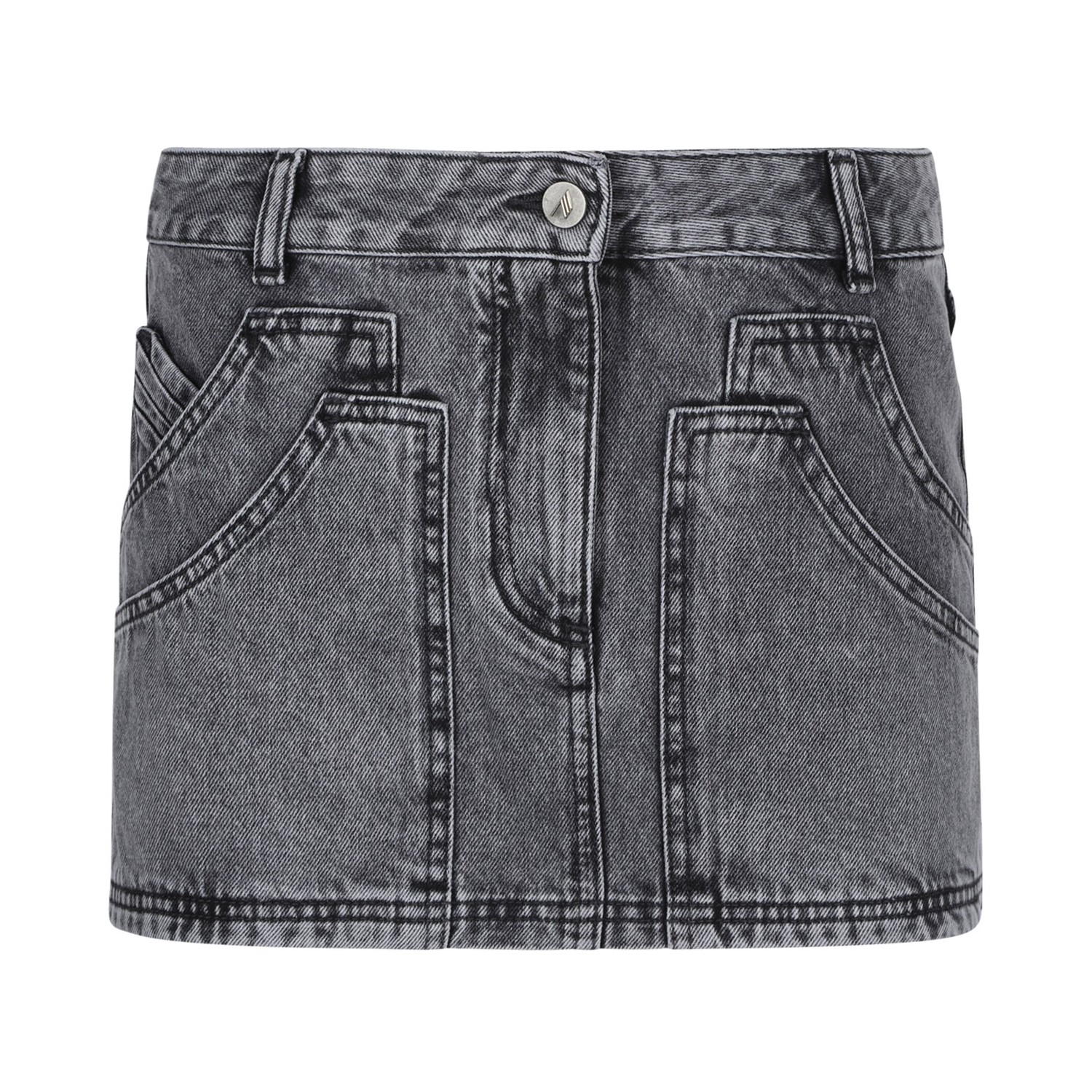 The Attico Black Denim Mini Skirt. Black cotton mini skirt, front button and zip fastening. Belt loops, multiple patch pockets, embroidered logo to the rear.