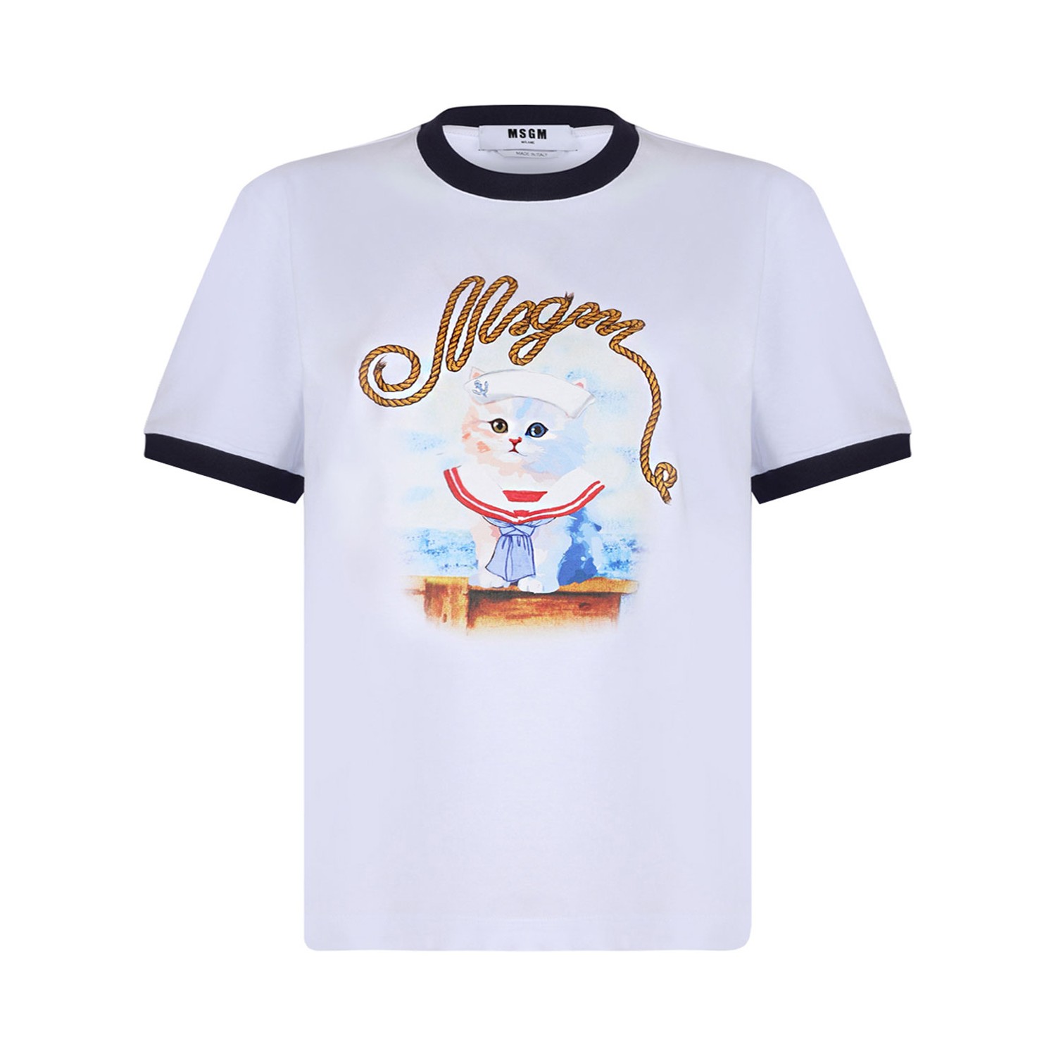 MSGM White Graphic Print T-Shirt. White cotton t-shirt, crew neck, graphic print to the front, short sleeves, ribbed cuffs.