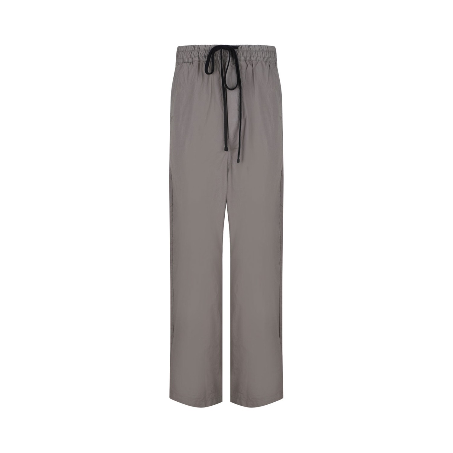 Thom Krom Grey Straight Trousers. Grey cotton trousers, drawstring fastening, elasticated waistband, two side welt pockets, two rear welt pockets.