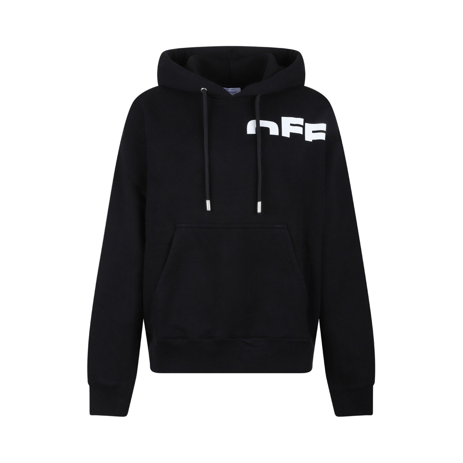 Off White Black Shared Logo Hoodie. Black cotton hoodie, drawstring hood, front pouch pocket, logo print at the chest, logo print to the rear.