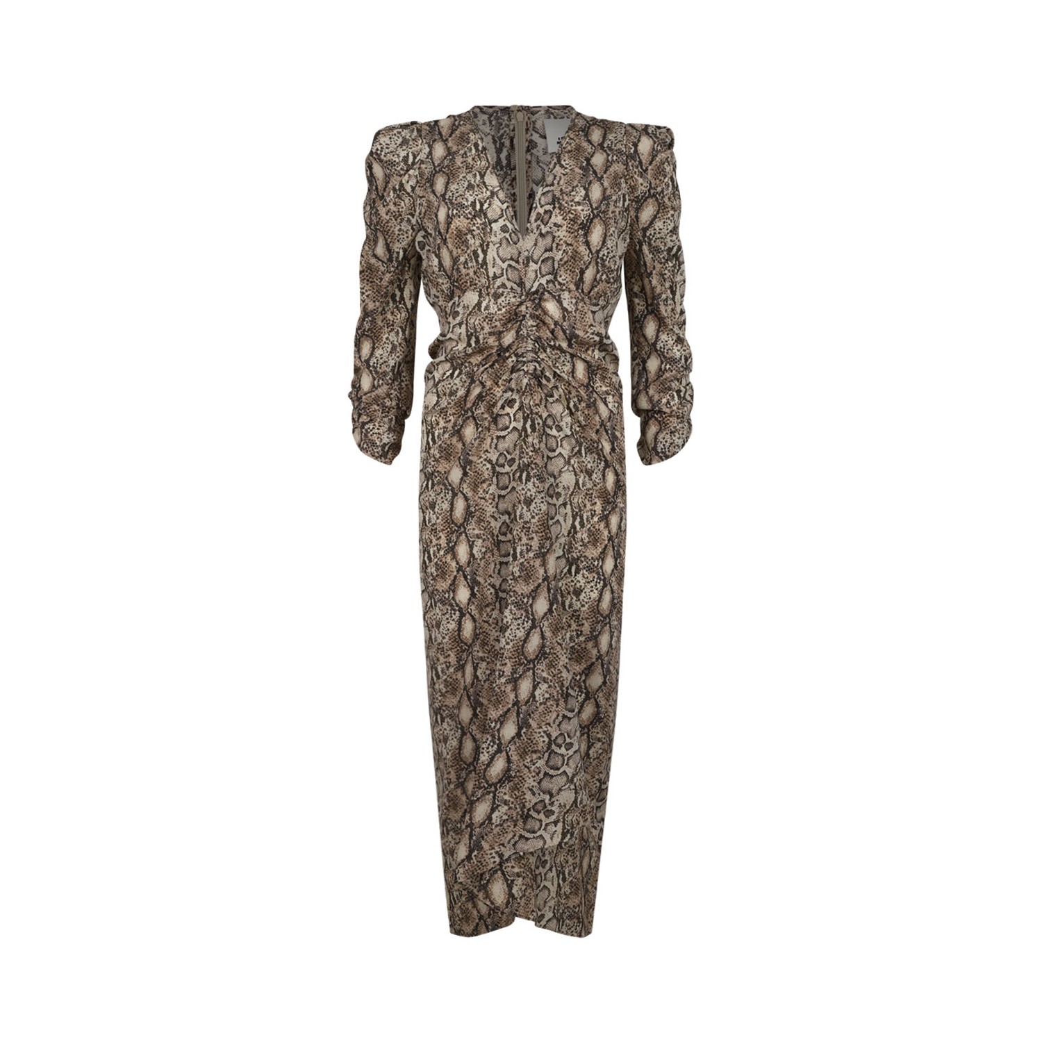 Isabel Marant Natural Albini Dress. Natural silk blend shirred midi dress with, snake print V-neck. Structured shoulders with thin straps, three-quarter length, sleeves Gathered sleeves and waist with draped effect. Concealed zip and button fastening at the back. Asymmetric hem, lightweight unlined fabric, flowing fit fitted at the waist.