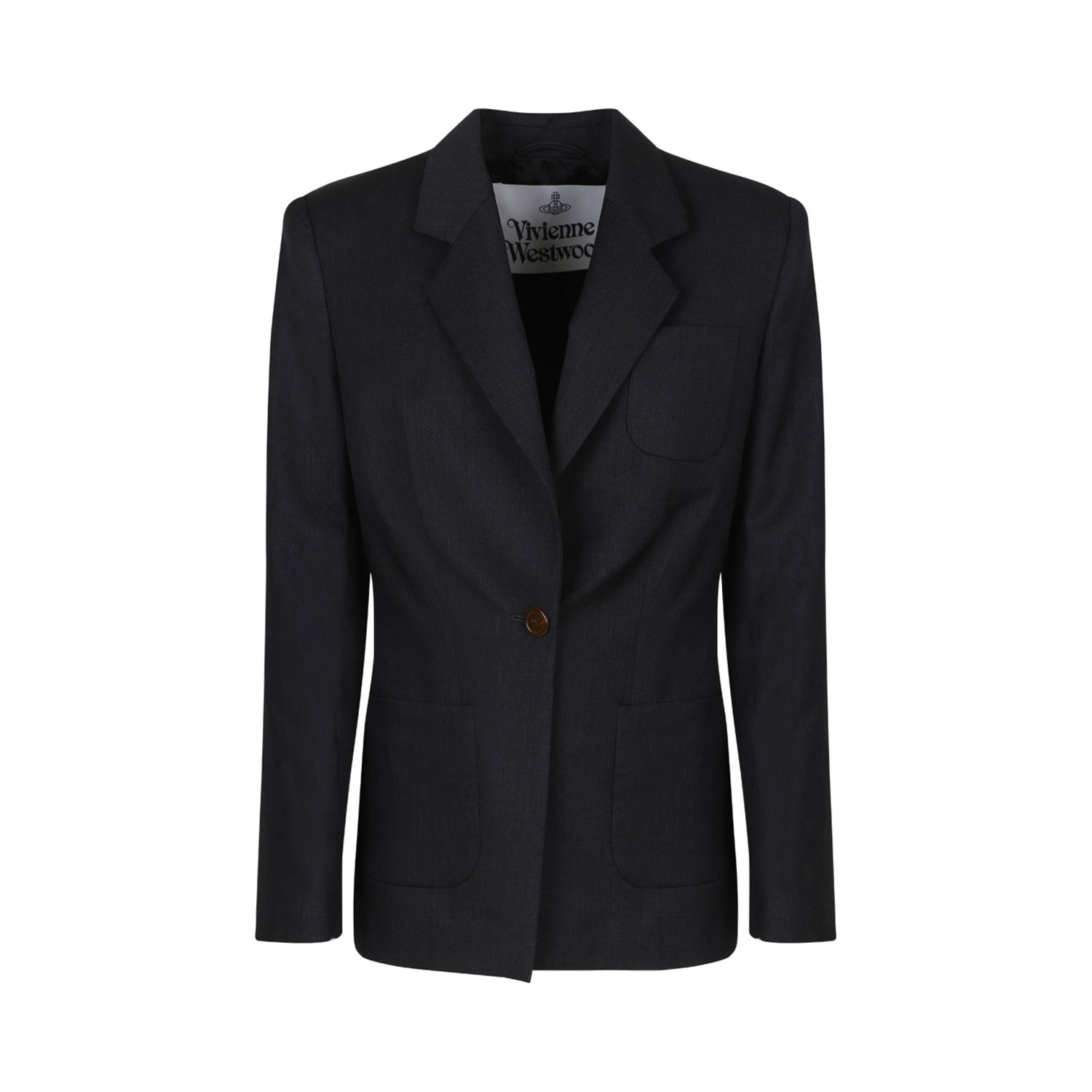 Vivienne Westwood Dark Grey Wool Blazer. Dark grey wool blend blazer, front button fastening, shoulder pads, buttoned cuffs, English rear vents.