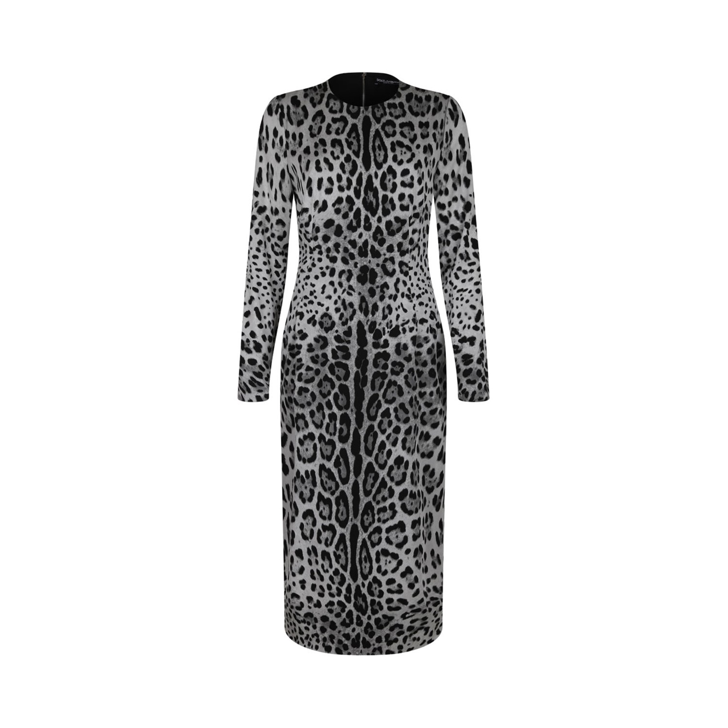 Dolce & Gabbana Leopard Print Dress. White and black all over leopard print dress, concealed rear zip fastening, round neck, long sleeves, rear slit, mid-length.
