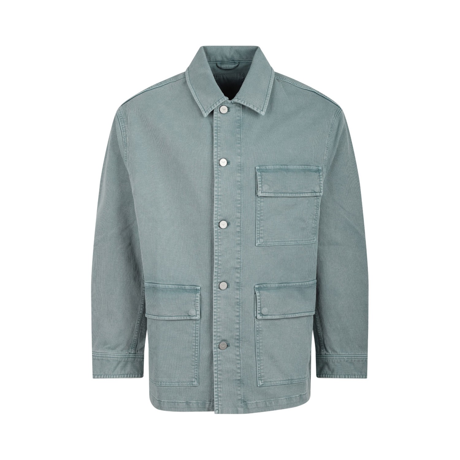 Emporio Armani Logo Engraved Jacket. Ocean blue cotton jacket, logo engraved, front button fastening, chest flap pocket, two side flap pockets, classic collar.