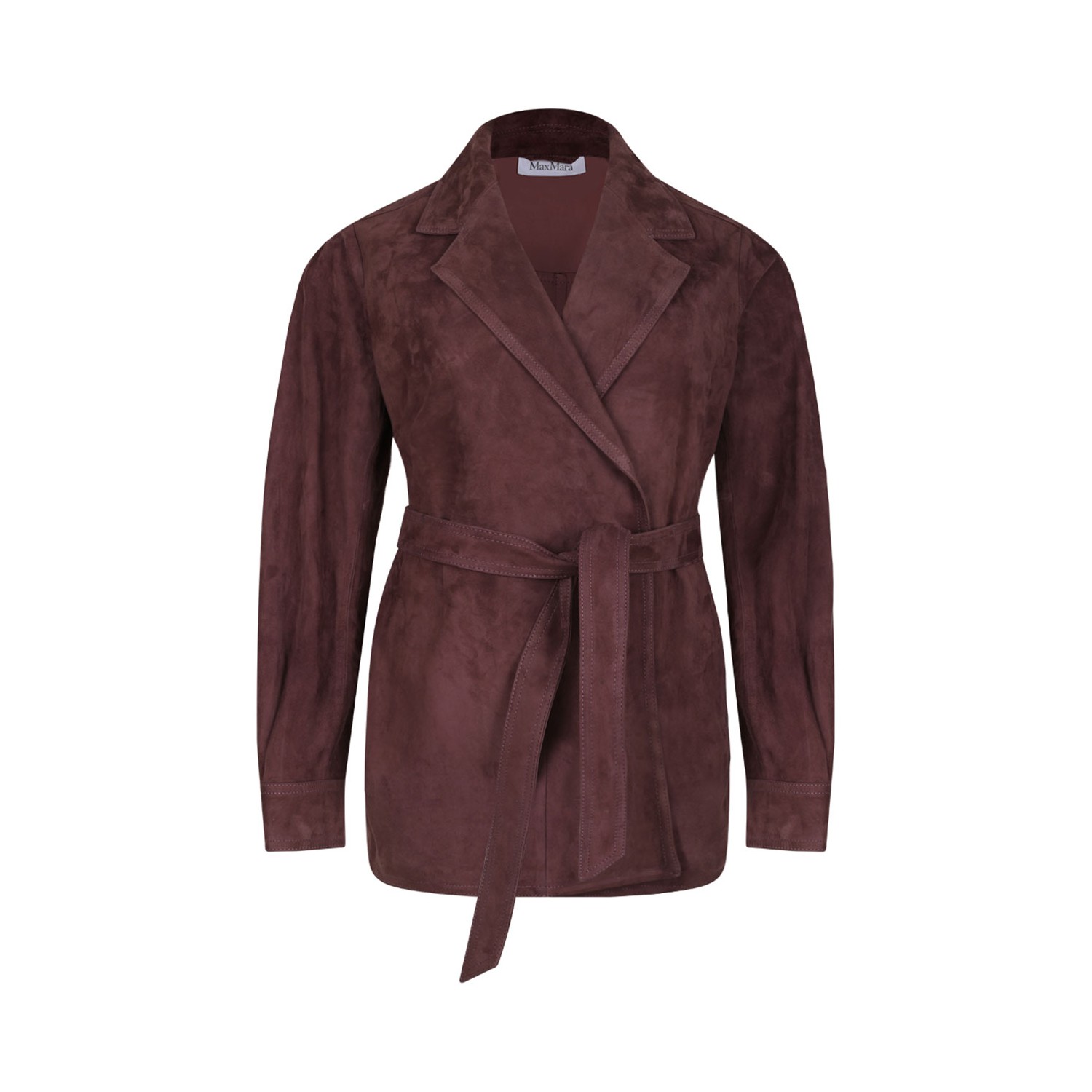 Max Mara Malva Frisco Jacket. Robe-style jacket made of soft suede nappa leather. The model features a classic lapel collar, long set-in sleeves with shirt cuffs and asymmetrical hem slightly longer on the back with side slits. Smooth nappa leather interior. The matching leather belt closure highlights the silhouette.