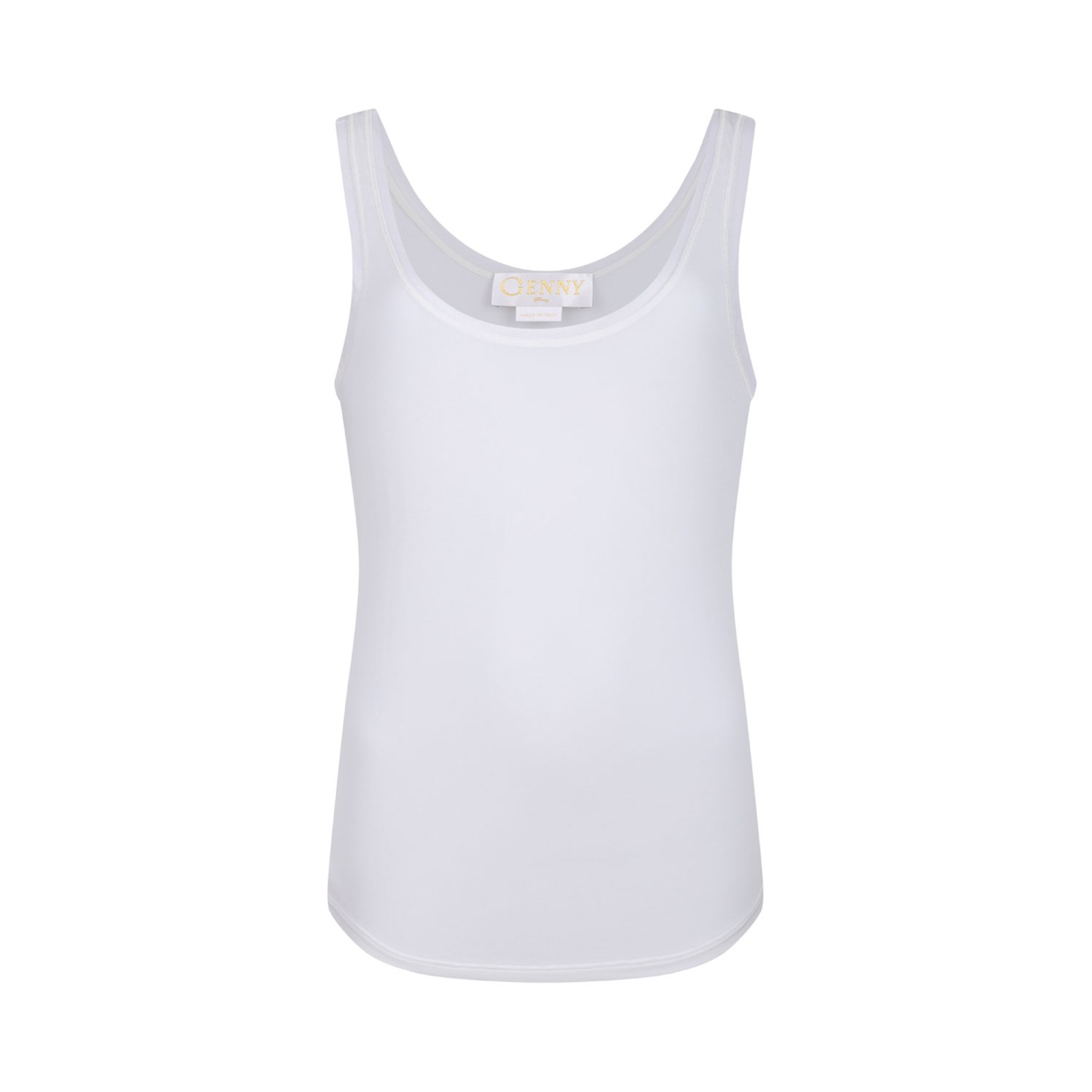 Genny White Scoop Neck Vest. White scoop neck vest, tulle trim, sleeveless.