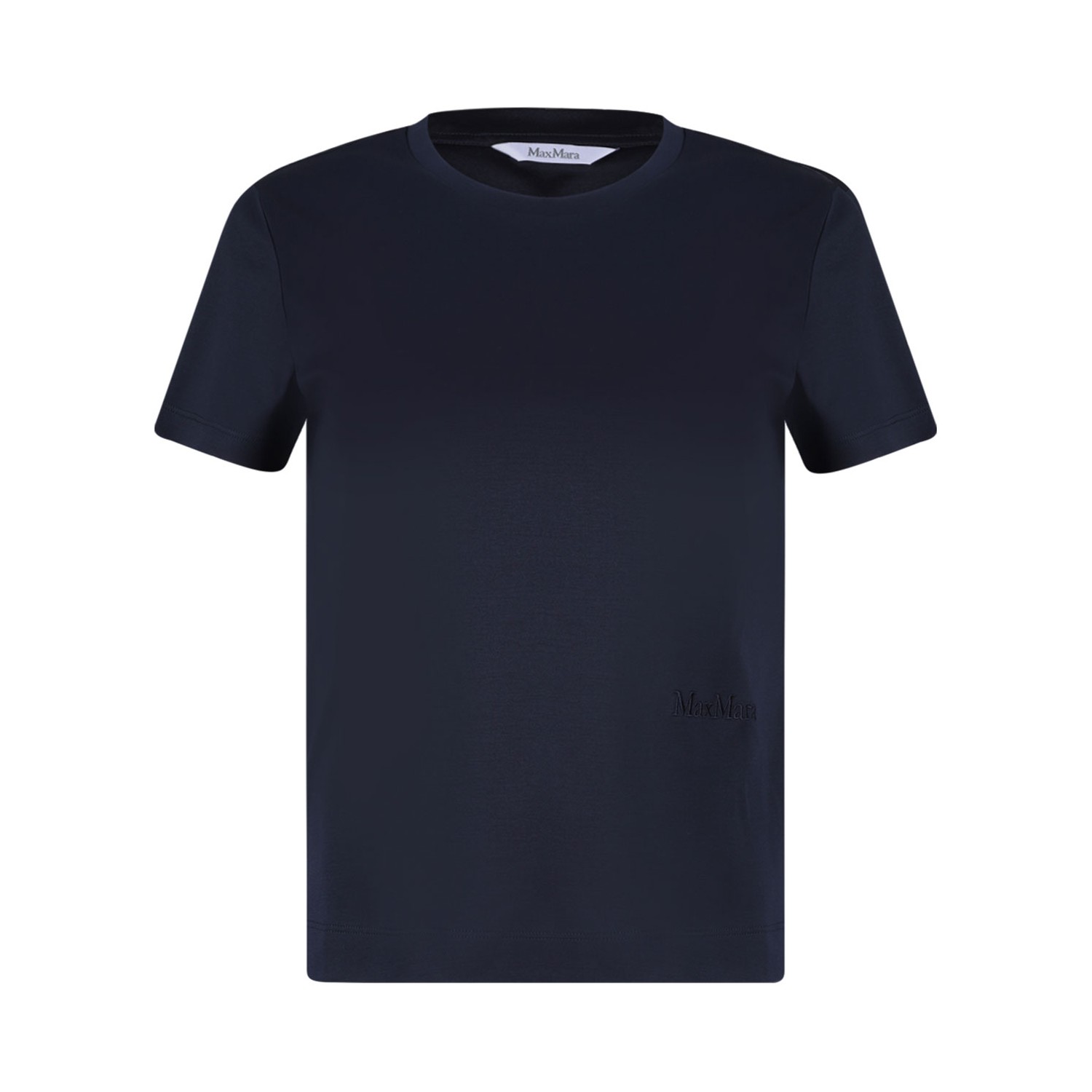 Max Mara Navy Blue Nerina T-Shirt. Crew neck, short sleeve T-shirt, made of soft pure cotton interlock. Basic model, personalized with Max Mara logo embroidered in tone on the bottom, left side worn.