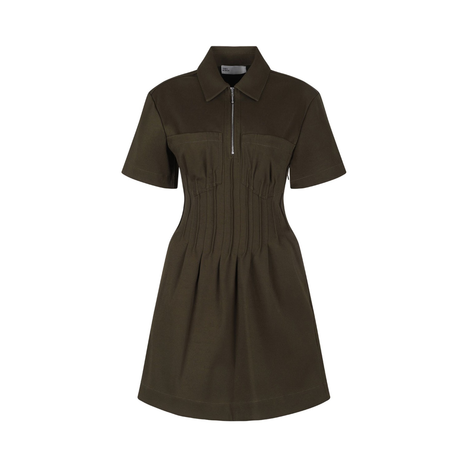 Tory Burch Olive Green Zip Front Dress. Olive green dress, half front zip fastening, classic collar, fitted waistline, two chest patch pockets.