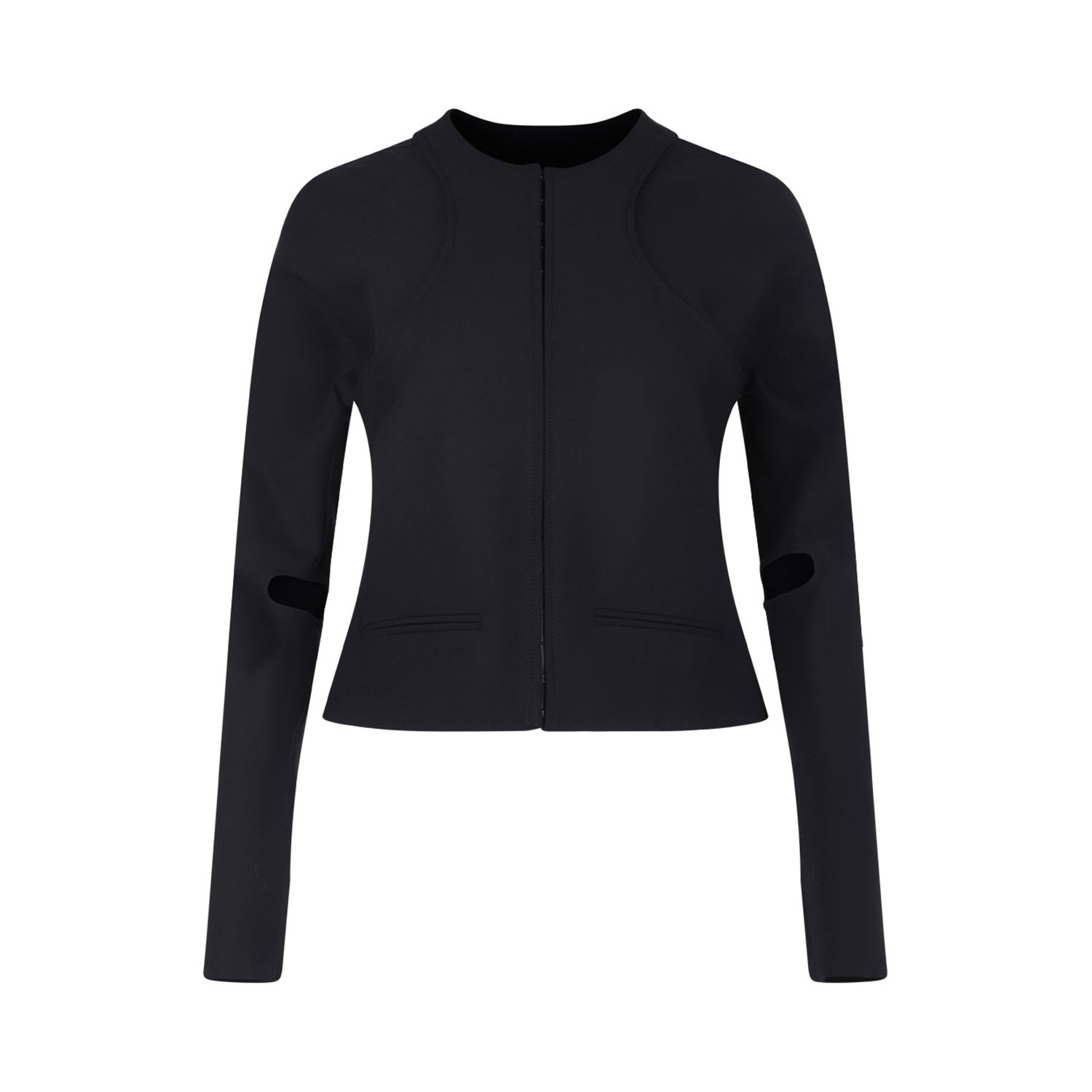 Courreges Black Scuba Fitted Jacket. Black fitted jacket with front hook and eye fastening, crew neck, long sleeves, cut-out detailing.