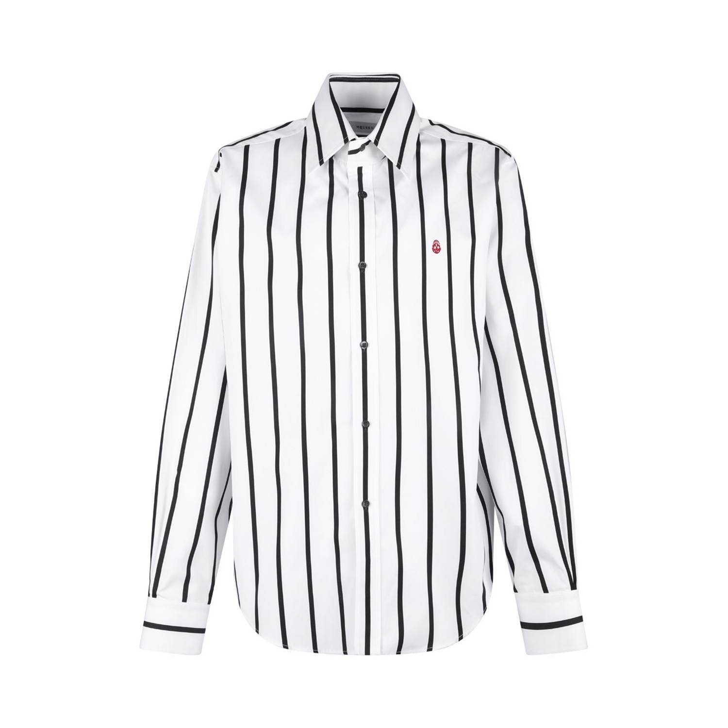 Alexander McQueen Skull Striped Shirt. White and black cotton shirt, front button fastening, long sleeves, buttoned cuffs, curved hem.