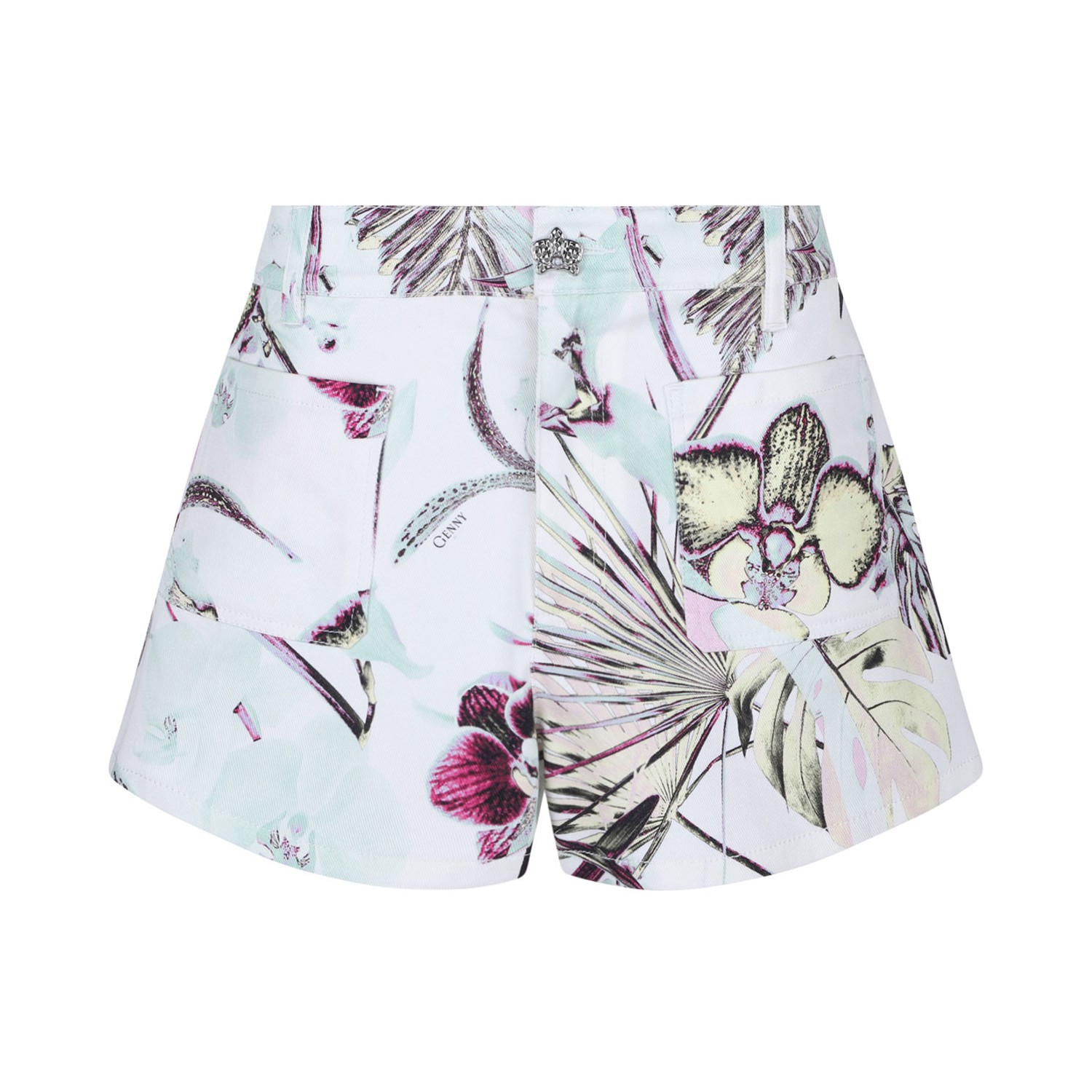 Genny Flower Jungle Print Shorts. Straight-fit shorts are crafted from stretch cotton drill for impeccable comfort. The design features a regular waist with a waistband and a front button closure, while patch pockets on the front and back add a casual-chic touch. The flower jungle print, vibrant and sophisticated, enhances the silhouette with a play of colors and details, making these shorts perfect for fresh and contemporary looks.